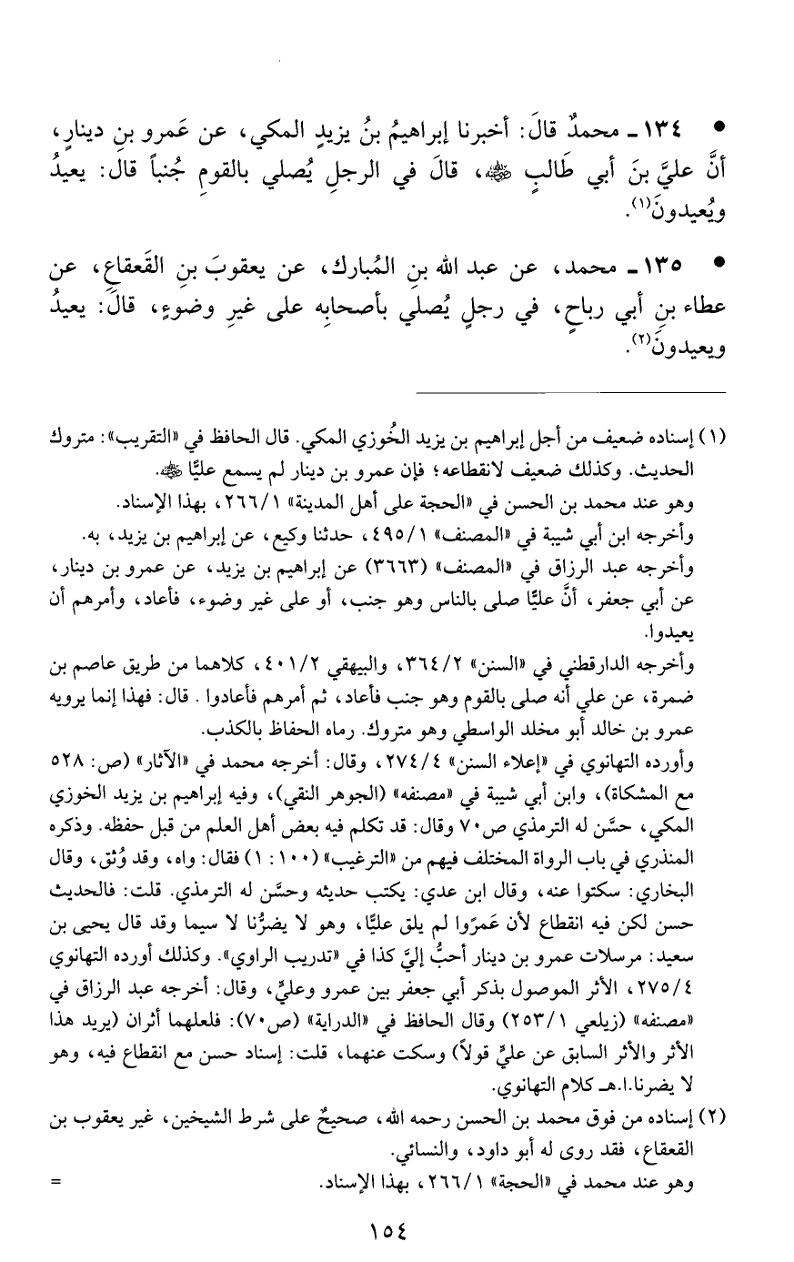 134 - مُحَمَّدٌ، قَالَ: أَخْبَرَنَا إِبْرَاهِيمُ بْنُ يَزِيدَ الْمَكِّيُّ، عَنْ عَمْرِو بْنِ دِينَارٍ، أَنَّ عَلِيَّ بْنَ أَبِي طَالِبٍ رَضِيَ اللَّهُ عَنْهُ، قَالَ فِي " الرَّجُلِ يُصَلِّي بِالْقَوْمِ جُنُبًا، قَالَ: يُعِيدُ وَيُعِيدُونَ "