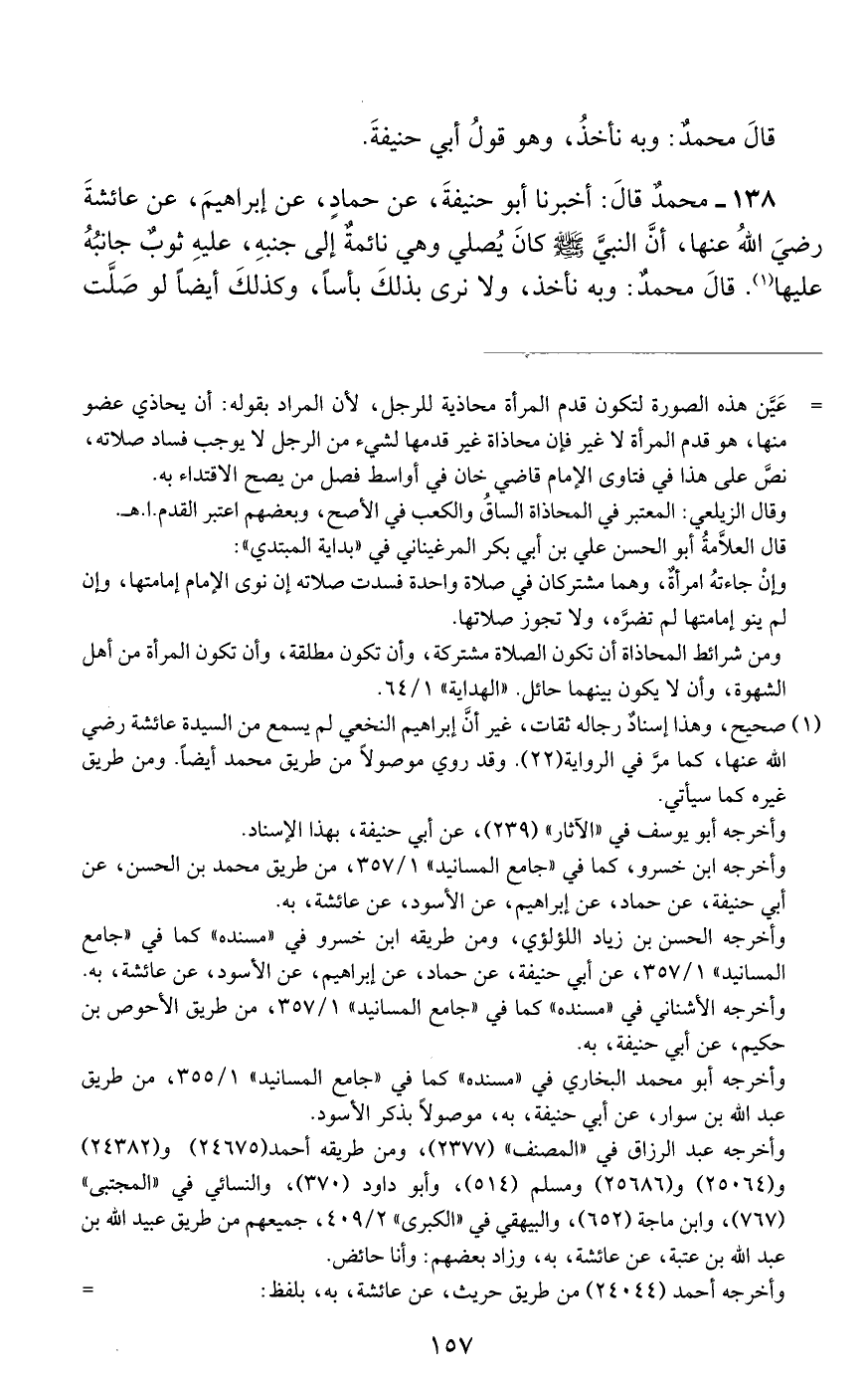 138 - مُحَمَّدٌ، قَالَ: أَخْبَرَنَا أَبُو حَنِيفَةَ، عَنْ حَمَّادٍ، عَنْ إِبْرَاهِيمَ، عَنْ عَائِشَةَ رَضِيَ اللَّهُ عَنْهَا أَنَّ النَّبِيَّ صَلَّى اللهُ عَلَيْهِ وَسَلَّمَ «كَانَ يُصَلِّي وَهِيَ نَائِمَةٌ إِلَى جَنْبِهِ عَلَيْهِ ثَوْبٌ جَانِبُهُ عَلَيْهَا»