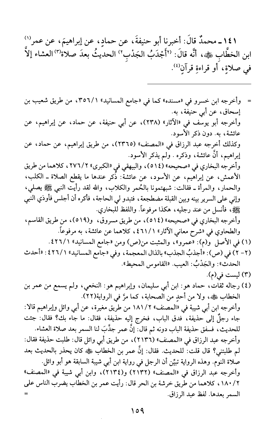 141 - مُحَمَّدٌ، قَالَ: أَخْبَرَنَا أَبُو حَنِيفَةَ، عَنْ حَمَّادٍ، عَنْ إِبْرَاهِيمَ، عَنْ عُمَرَ بْنِ الْخَطَّابِ رَضِيَ اللَّهُ عَنْهُ أنه قَالَ: «أَجْدَبُ الْجَدْبِ الْحَدِيثُ بَعْدَ صَلَاةِ الْعِشَاءِ إِلَّا فِي صَلَاةٍ أَوْ قِرَاءَةِ قُرْآنٍ»