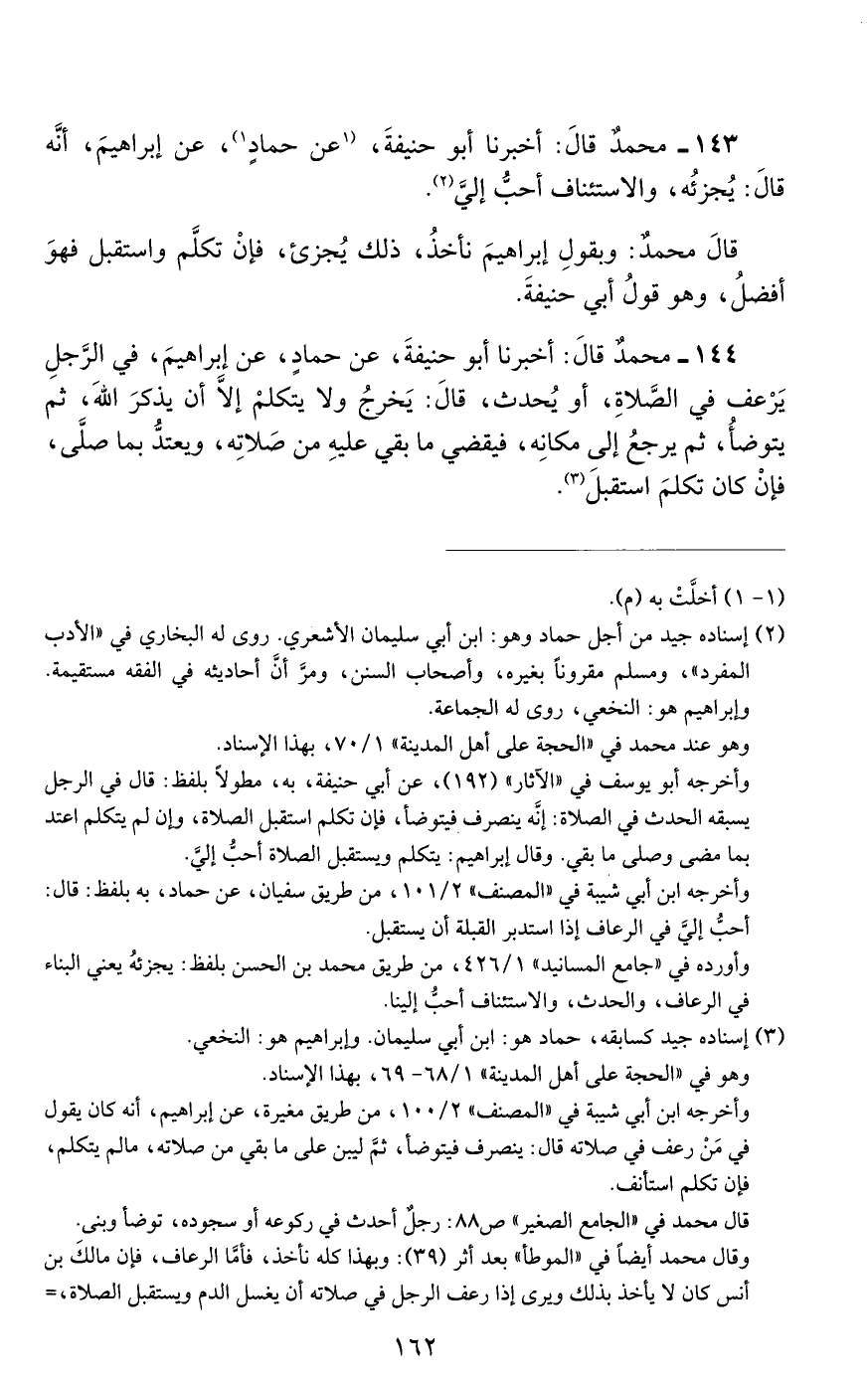 144 - مُحَمَّدٌ، قَالَ: أَخْبَرَنَا أَبُو حَنِيفَةَ، عَنْ حَمَّادٍ، عَنْ إِبْرَاهِيمَ " فِي الرَّجُلِ يَرْعُفُ فِي الصَّلَاةِ أَوْ يُحْدِثُ. قَالَ: يَخْرُجُ وَلَا يَتَكَلَّمُ إِلَّا أَنْ يَذْكُرَ اللَّهَ، ثُمَّ يَتَوَضَّأُ، ثُمَّ يَرْجِعُ إِلَى مَكَانِهِ، فَيَقْضِيَ مَا بَقِيَ عَلَيْهِ مِنْ صَلَاتِهِ، وَيَعْتَدُّ بِمَا صَلَّى فَإِنْ كَانَ تَكَلَّمَ اسْتَقْبَلَ "