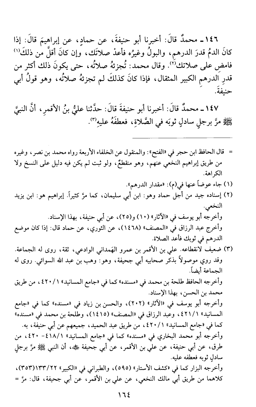 146 - مُحَمَّدٌ، قَالَ: أَخْبَرَنَا أَبُو حَنِيفَةَ، عَنْ حَمَّادٍ، عَنْ إِبْرَاهِيمَ، قَالَ: «إِذَا كَانَ الدَّمُ قَدْرَ الدِّرْهَمِ وَالْبَوْلُ وَغَيْرُهُ، فَأَعِدْ صَلَاتَكَ، وَإِنْ كَانَ أَقَلَّ من ذلك الدِّرْهَمِ، فَامْضِ عَلَى صَلَاتِكَ»