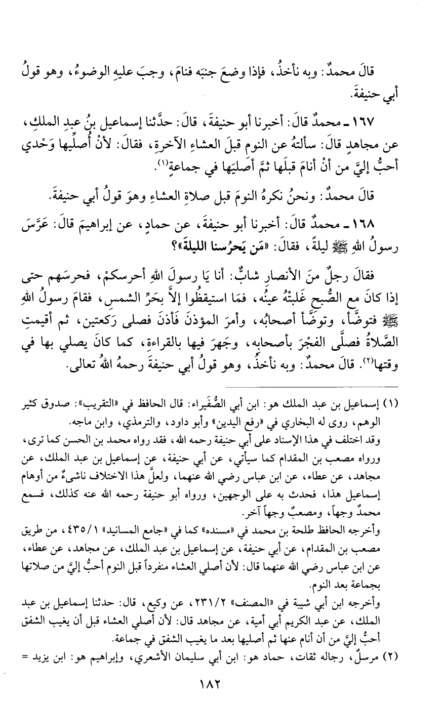 167 - مُحَمَّدٌ، قَالَ: أَخْبَرَنَا أَبُو حَنِيفَةَ، قَالَ حَدَّثَنَا إِسْمَاعِيلُ بْنُ عَبْدِ الْمَلِكِ، عَنْ مُجَاهِدٍ، قَالَ: سَأَلْتُهُ عَنِ النَّوْمِ قَبْلَ الْعِشَاءِ الْآخِرَةِ، فَقَالَ: «لَأَنْ أُصَلِّيَهَا وَحْدِي أَحَبُّ إِلَيَّ مِنْ أَنْ أَنَامَ قَبْلَهَا ثُمَّ أُصَلِّيَهَا فِي جَمَاعَةٍ»