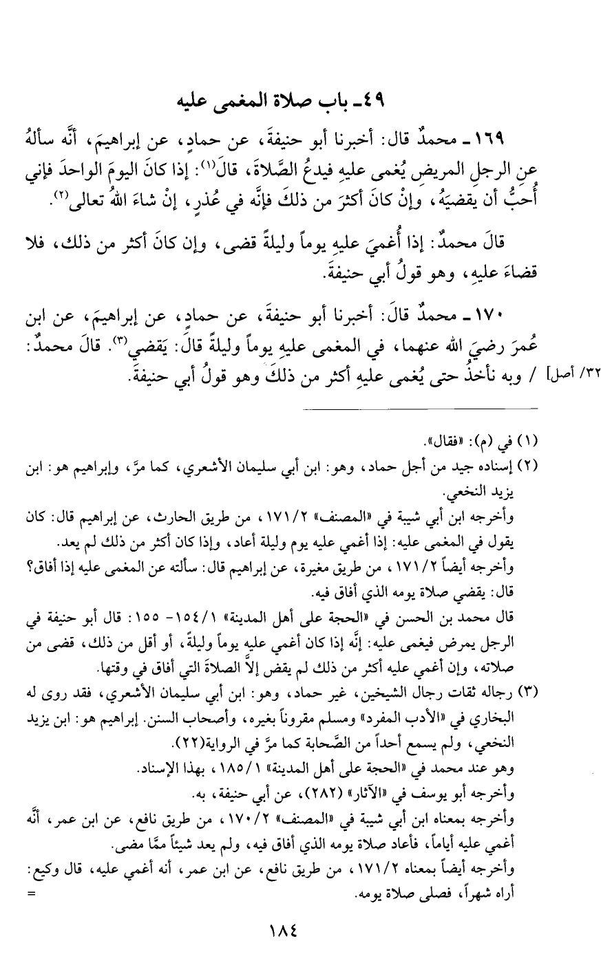 169 - مُحَمَّدٌ، قَالَ: أَخْبَرَنَا أَبُو حَنِيفَةَ، عَنْ حَمَّادٍ، عَنْ إِبْرَاهِيمَ أَنَّهُ سَأَلَهُ عَنِ الرَّجُلِ الْمَرِيضِ يُغْمَى عَلَيْهِ فَيَدَعُ الصَّلَاةَ، قَالَ: «إِذَا كَانَ الْيَوْمُ الْوَاحِدُ، فَإِنِّي أُحِبُّ أَنْ يَقْضِيَهُ، وَإِنْ كَانَ أَكْثَرَ مِنْ ذَلِكَ، فَإِنَّهُ فِي عُذْرٍ إِنْ شَاءَ اللَّهُ تعالى»