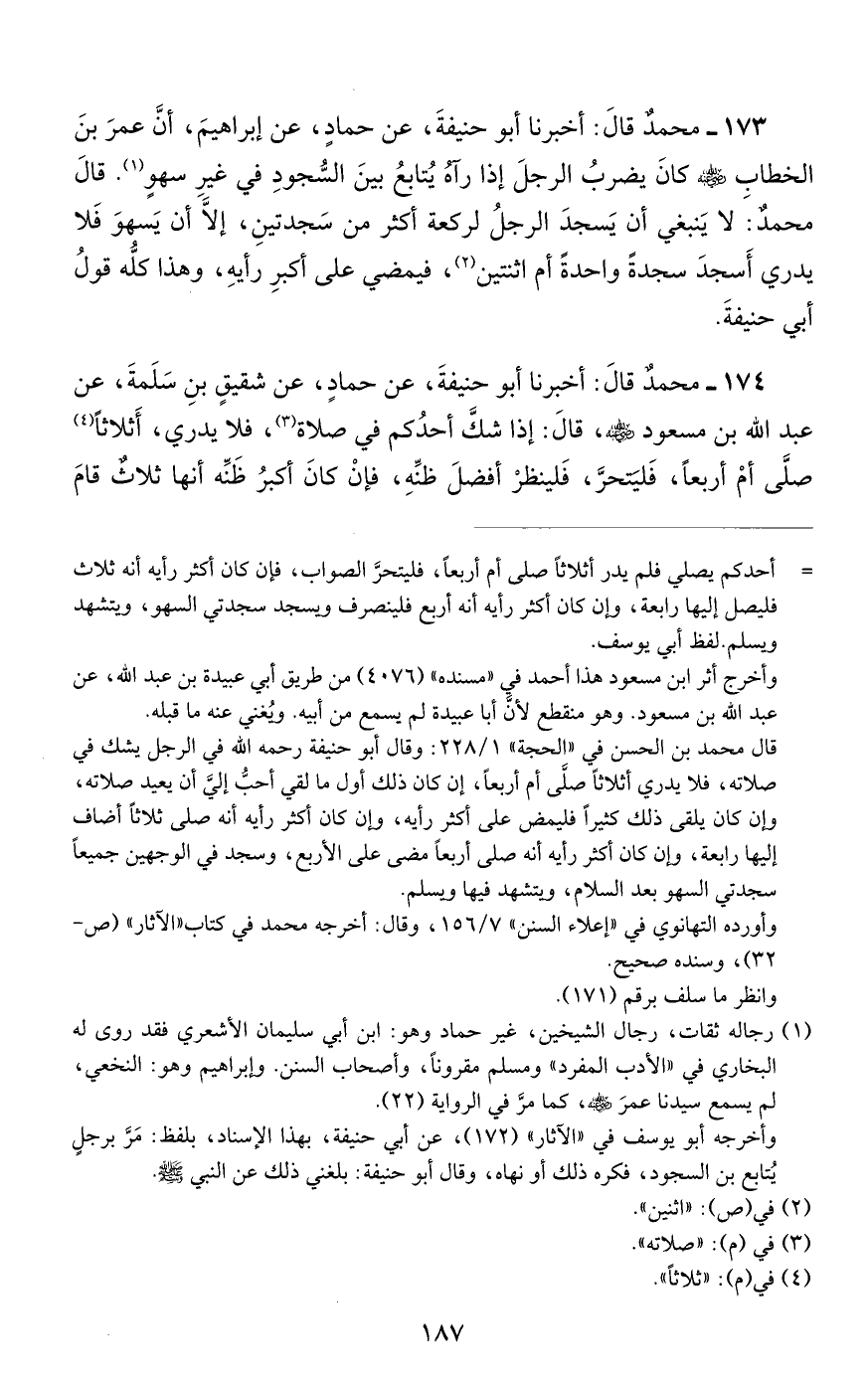 173 - مُحَمَّدٌ، قَالَ: أَخْبَرَنَا أَبُو حَنِيفَةَ، عَنْ حَمَّادٍ، عَنْ إِبْرَاهِيمَ، أَنَّ عُمَرَ بْنَ الْخَطَّابِ رَضِيَ اللَّهُ عَنْهُ كَانَ يَضْرِبُ الرَّجُلَ إِذَا رَآهُ يُتَابِعُ بَيْنَ السُّجُودِ فِي غَيْرِ سَهْوٍ "
