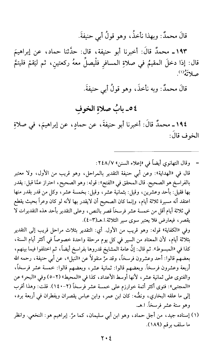 194 - مُحَمَّدٌ، قَالَ: أَخْبَرَنَا أَبُو حَنِيفَةَ، عَنْ حَمَّادٍ، عَنْ إِبْرَاهِيمَ، فِي صَلَاةِ الْخَوْفِ قَالَ: