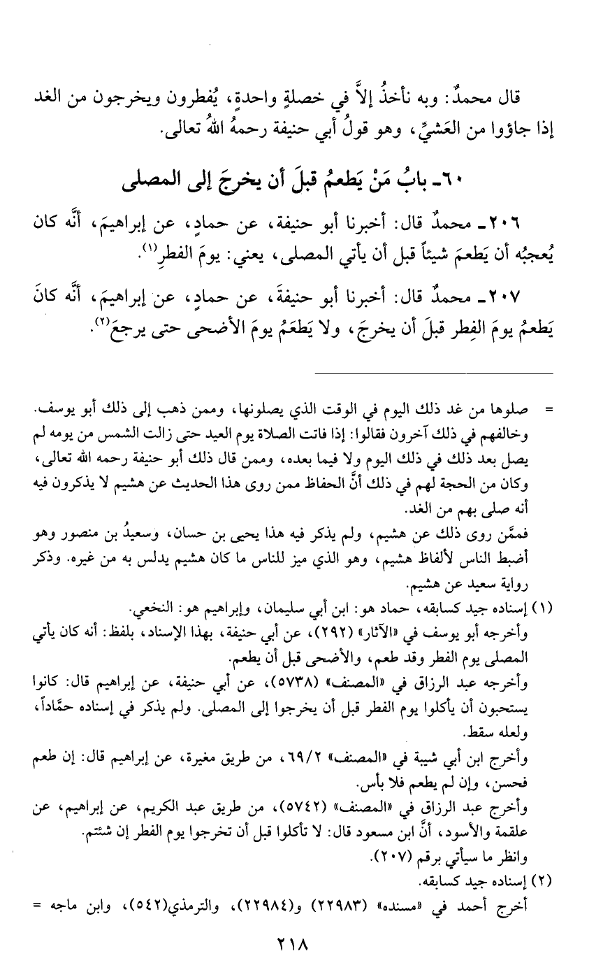206 - مُحَمَّدٌ، قَالَ: أَخْبَرَنَا أَبُو حَنِيفَةَ، عَنْ حَمَّادٍ، عَنْ إِبْرَاهِيمَ، أَنَّهُ كَانَ يُعْجِبُهُ أَنْ «يَطْعَمَ شَيْئًا قَبْلَ أَنْ يَأْتِيَ الْمُصَلَّى». يَعْنِي يَوْمَ الْفِطْرِ