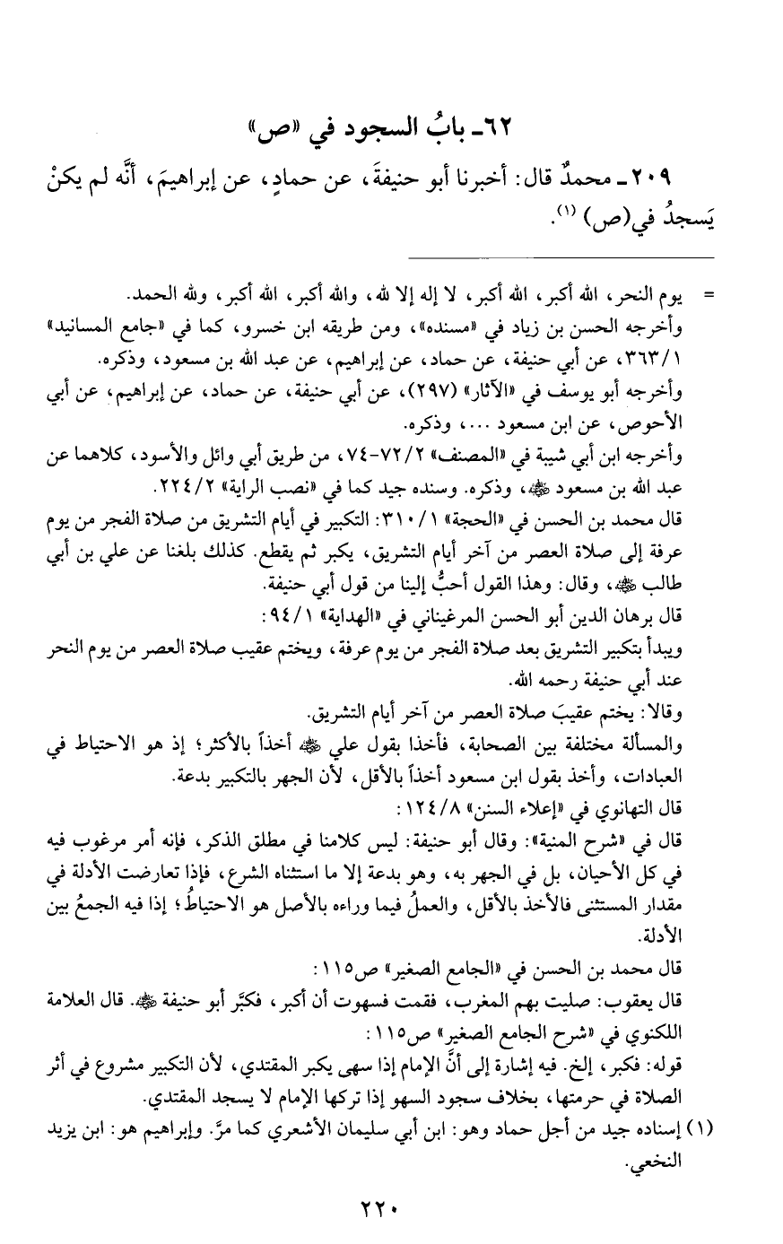 209 - مُحَمَّدٌ، قَالَ: أَخْبَرَنَا أَبُو حَنِيفَةَ، عَنْ حَمَّادٍ، عَنْ إِبْرَاهِيمَ أَنَّهُ «لَمْ يَكُنْ يَسْجُدُ فِي ص #221# وَعَنْ عَبْدِ اللَّهِ بْنِ مَسْعُودٍ رَضِيَ اللَّهُ عَنْهُ أَنَّهُ» لَمْ يَكُنْ يَسْجُدُ فِيهَا "