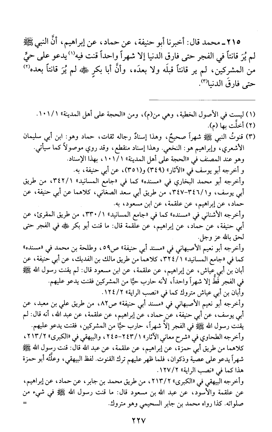 215 - مُحَمَّدٌ، قَالَ: أَخْبَرَنَا أَبُو حَنِيفَةَ، عَنْ حَمَّادٍ، عَنْ إِبْرَاهِيمَ، أَنَّ النَّبِيَّ صَلَّى اللهُ عَلَيْهِ وَسَلَّمَ لَمْ يُرَ قَانِتًا فِي الْفَجْرِ حَتَّى فَارَقَ الدُّنْيَا إِلَّا شَهْرًا وَاحِدًا، قَنَتَ فِيهِ يَدْعُو عَلَى حَيٍّ مِنَ الْمُشْرِكِينَ، لَمْ يُرَ قَانِتًا قَبْلَهُ وَلَا بَعْدَهُ، وَإِنَّ أَبَا بَكْرٍ رَضِيَ اللَّهُ عَنْهُ لَمْ يُرَ قَانِتًا بَعْدَهُ حَتَّى فَارَقَ الدُّنْيَا "
