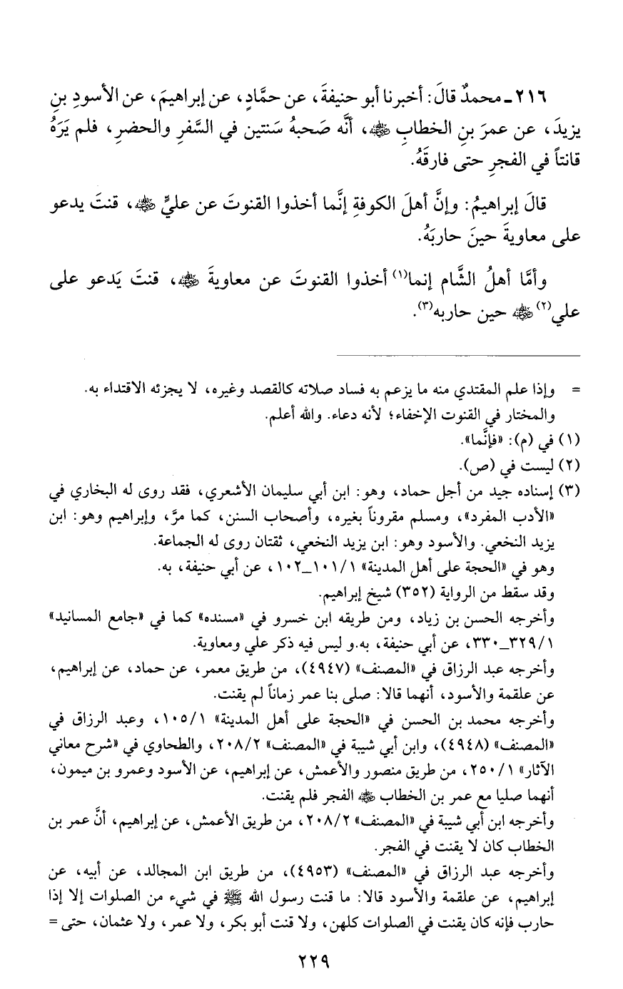 216 - مُحَمَّدٌ، قَالَ: أَخْبَرَنَا أَبُو حَنِيفَةَ، عَنْ حَمَّادٍ، عَنْ إِبْرَاهِيمَ، عَنِ الْأَسْوَدِ بْنِ يَزِيدَ، عَنْ عُمَرَ بْنِ الْخَطَّابِ رَضِيَ اللَّهُ عَنْهُ أَنَّهُ صَحِبَهُ سَنَتَيْنِ فِي السَّفَرِ وَالْحَضَرِ فَلَمْ يَرَهُ قَانِتًا فِي الْفَجْرِ حَتَّى فَارَقَهُ. قَالَ: إِبْرَاهِيمُ: وَإِنَّ أَهْلَ الْكُوفَةِ إِنَّمَا أَخَذُوا الْقُنُوتَ عَنْ عَلِيٍّ رَضِيَ اللَّهُ عَنْهُ، قَنَتَ يَدْعُو عَلَى مُعَاوِيَةَ حِينَ حَارَبَهُ، وَأَمَّا أَهْلُ الشَّامِ إِنَّمَا أَخَذُوا الْقُنُوتَ عَنْ مُعَاوِيَةَ رَضِيَ اللَّهُ عَنْهُ قَنَتَ يَدْعُو عَلَى عَلِيٍّ رَضِيَ اللَّهُ عَنْهُ حِينَ حَارَبَهُ "