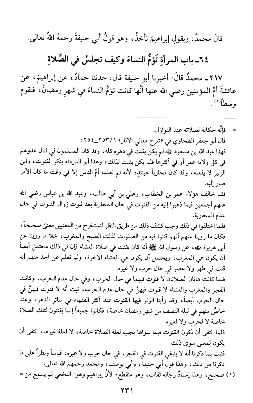 217 - مُحَمَّدٌ، قَالَ: أَخْبَرَنَا أَبُو حَنِيفَةَ، قَالَ حَدَّثَنَا حَمَّادٌ، عَنْ إِبْرَاهِيمَ، عَنْ عَائِشَةَ أُمِّ الْمُؤْمِنِينَ رَضِيَ اللَّهُ عَنْهَا أَنَّهَا كَانَتْ تَؤُمُّ النِّسَاءَ فِي شَهْرِ رَمَضَانَ فَتَقُومُ وَسَطًا "