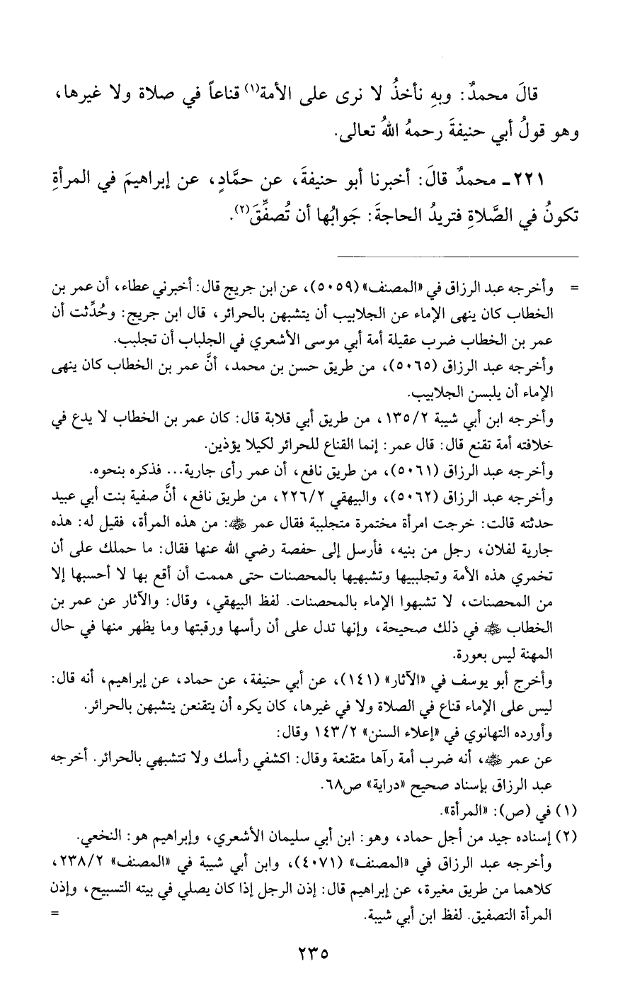 221 - مُحَمَّدٌ، قَالَ: أَخْبَرَنَا أَبُو حَنِيفَةَ، عَنْ حَمَّادٍ، عَنْ إِبْرَاهِيمَ فِي الْمَرْأَةِ تَكُونُ فِي الصَّلَاةِ، فَتُرِيدُ الْحَاجَةَ، جَوَابُهَا أَنْ تُصَفِّقَ "
