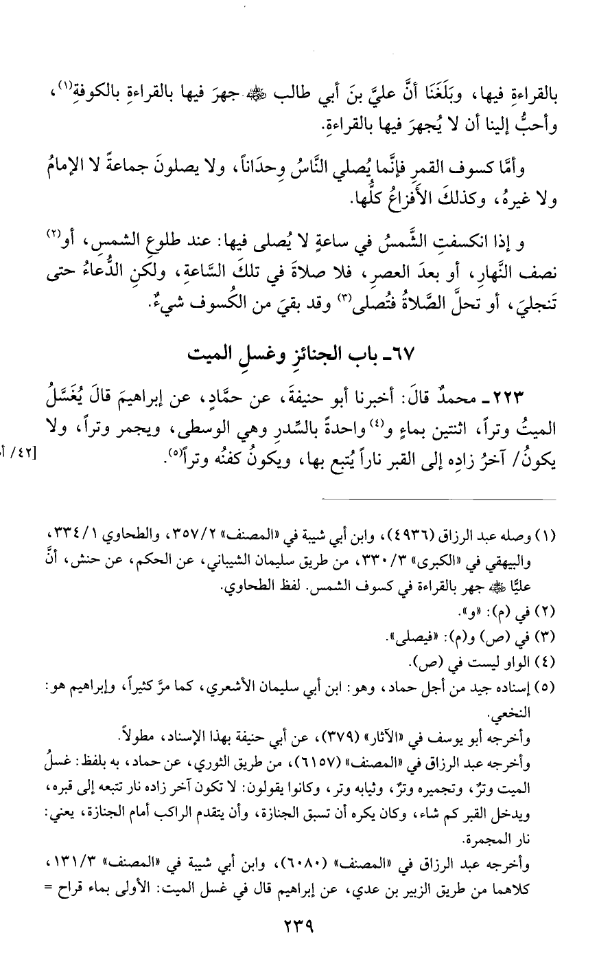 223 - مُحَمَّدٌ، قَالَ: أَخْبَرَنَا أَبُو حَنِيفَةَ، عَنْ حَمَّادٍ، عَنْ إِبْرَاهِيمَ، قَالَ: يُغَسَّلُ الْمَيِّتُ وِتْرًا اثْنَتَيْنِ بِمَاءٍ، وَوَاحِدَةً بِالسِّدْرِ، وَهِيَ الْوُسْطَى، وَيُجَمَّرُ وِتْرًا، وَلَا يَكُونُ آخِرَ زَادِهِ إِلَى الْقَبْرِ نَارٌ يُتْبَعُ بِهَا، وَيَكُونُ كَفَنُهُ وِتْرًا
