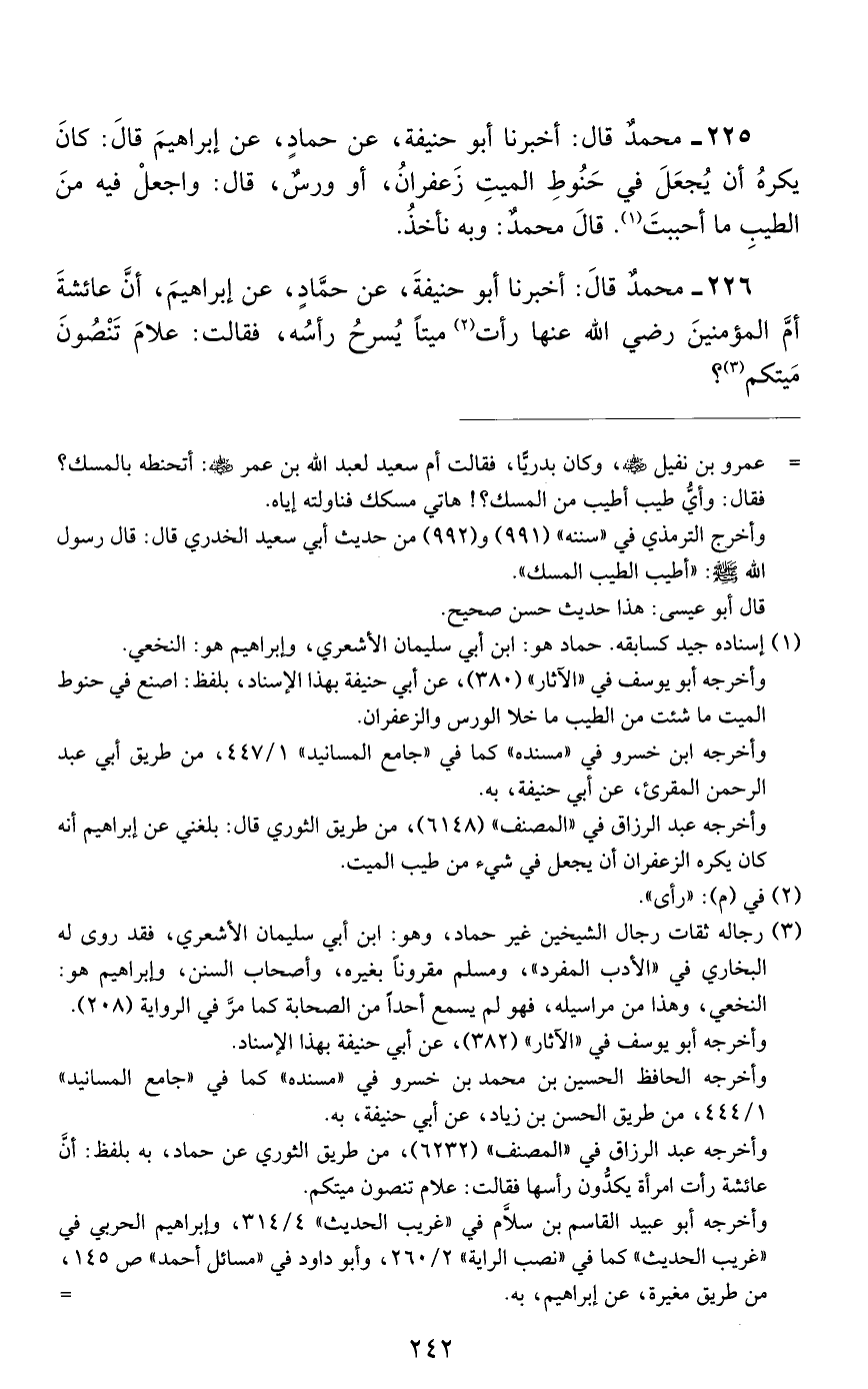 225 - مُحَمَّدٌ، قَالَ: أَخْبَرَنَا أَبُو حَنِيفَةَ عَنْ حَمَّادٍ، عَنْ إِبْرَاهِيمَ، قَالَ: كَانَ يُكْرَهُ أَنْ يُجْعَلَ فِي حَنُوطِ الْمَيِّتِ زَعْفَرَانٌ أَوْ وَرْسٌ، قَالَ: وَاجْعَلْ فِيهِ مِنَ الطِّيبِ مَا أَحْبَبْتَ