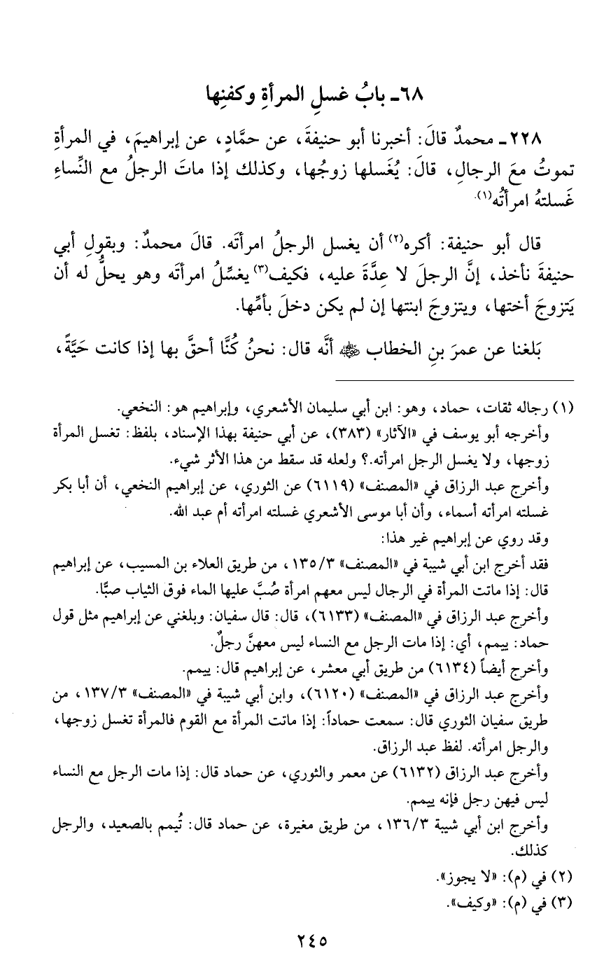 228 - مُحَمَّدٌ، قَالَ: أَخْبَرَنَا أَبُو حَنِيفَةَ، عَنْ حَمَّادٍ عَنْ إِبْرَاهِيمَ فِي الْمَرْأَةِ تَمُوتُ مَعَ الرِّجَالِ، قَالَ: «يُغَسِّلُهَا زَوْجُهَا، وَكَذَلِكَ إِذَا مَاتَ الرَّجُلُ مَعَ النِّسَاءِ غَسَّلَتْهُ امْرَأَتُهُ»