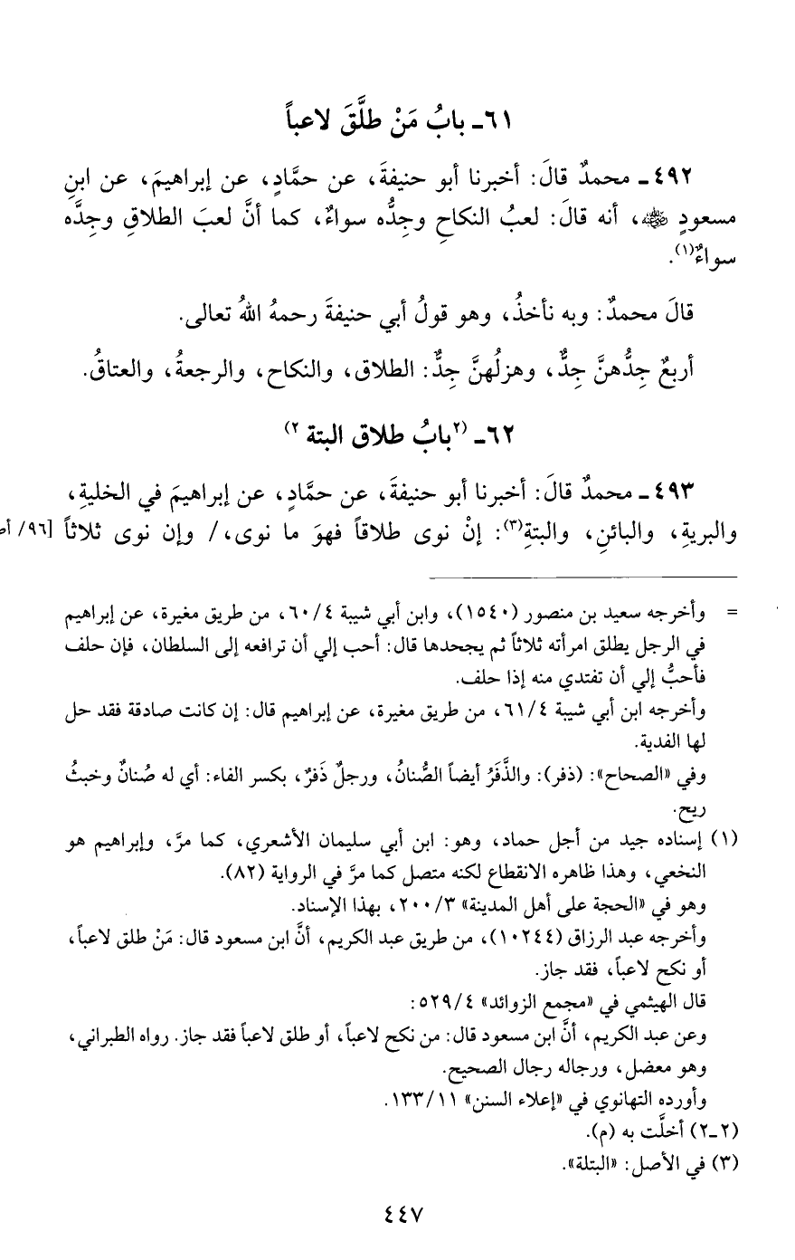 492 - محمد قال: أخبرنا أبو حنيفة, عن حماد, عن إبراهيم, عن ابن مسعود رضي الله عنه, أنه قال: لعب النكاح وجده سواء, كما أن لعب الطلاق وجده سواء.