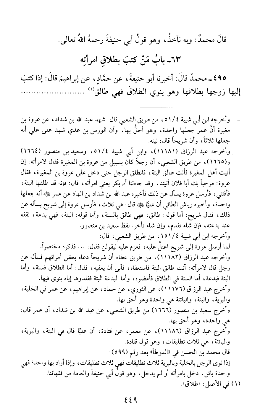 495 - محمد قال: أخبرنا أبو حنيفة, عن حماد, عن إبراهيم قال: إذا كتب إليها زوجها بطلاقها وهو ينوي الطلاق فهي طالق #450# حين كتبه.