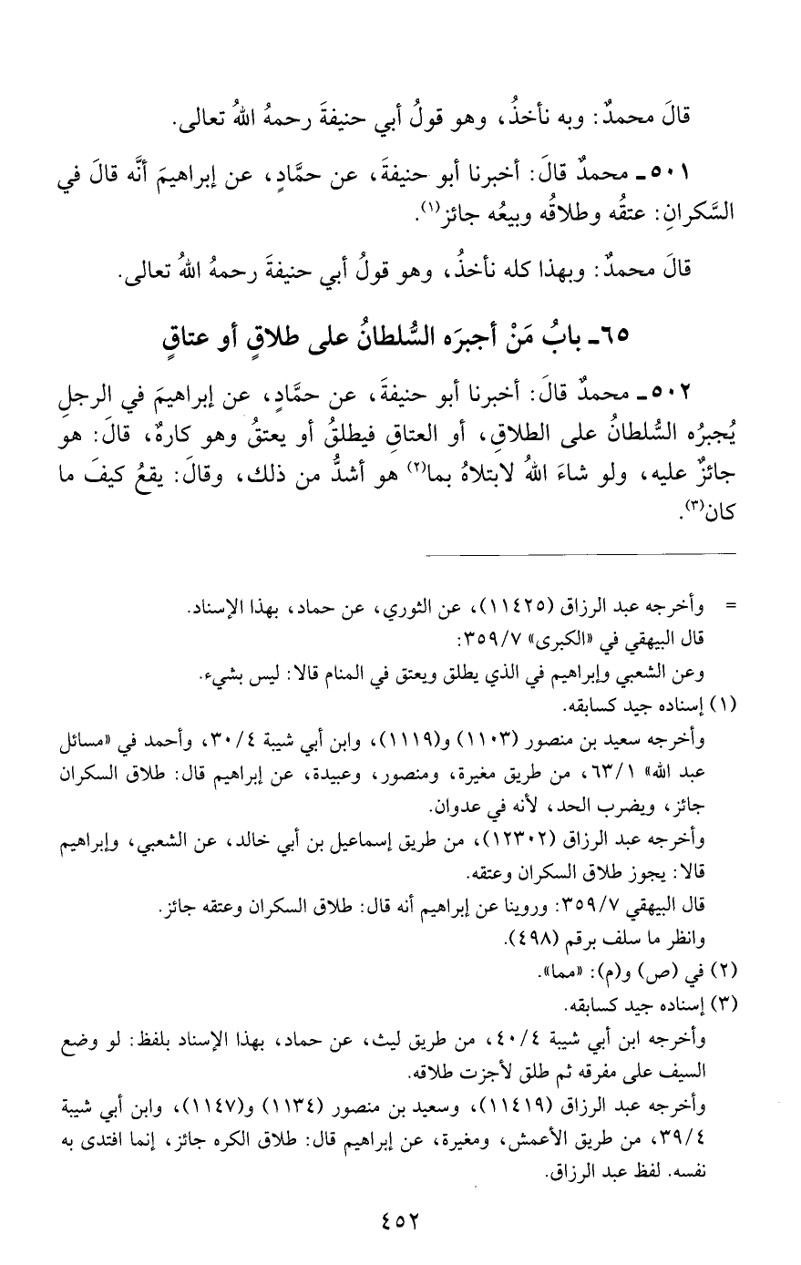 501 - محمد قال: أخبرنا أبو حنيفة, عن حماد, عن إبراهيم أنه قال في السكران: عتقه وطلاقه وبيعه جائز.