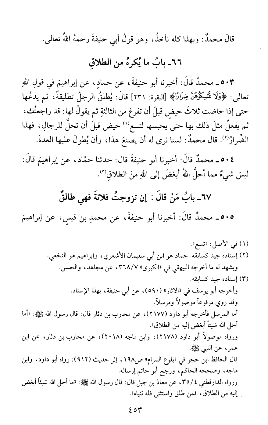 504 - محمد قال: أخبرنا أبو حنيفة قال: حدثنا حماد, عن إبراهيم قال: ليس شيء مما أحل الله أبغض إلى الله من الطلاق.