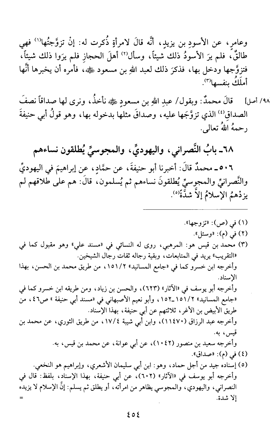 506 - محمد قال: أخبرنا أبو حنيفة, عن حماد, عن إبراهيم في اليهودي والنصراني والمجوسي يطلقون نساءهم ثم يسلمون, قال: هم على طلاقهم لم يزدهم الإسلام إلا شدة.