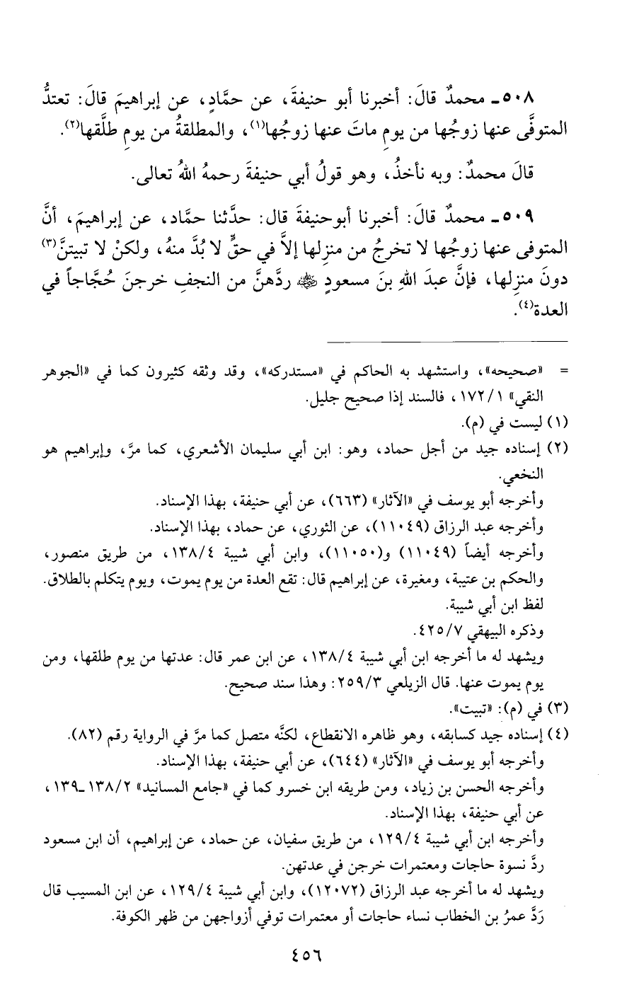509 - محمد قال: أخبرنا أبو حنيفة قال: حدثنا حماد, عن إبراهيم, أن المتوفى عنها زوجها لا تخرج من منزلها إلا في حق لا بد منه, ولكن لا تبيتن دون منزلها, فإن عبد الله بن مسعود رضي الله عنه ردهن من النجف خرجن حجاجا في العدة.