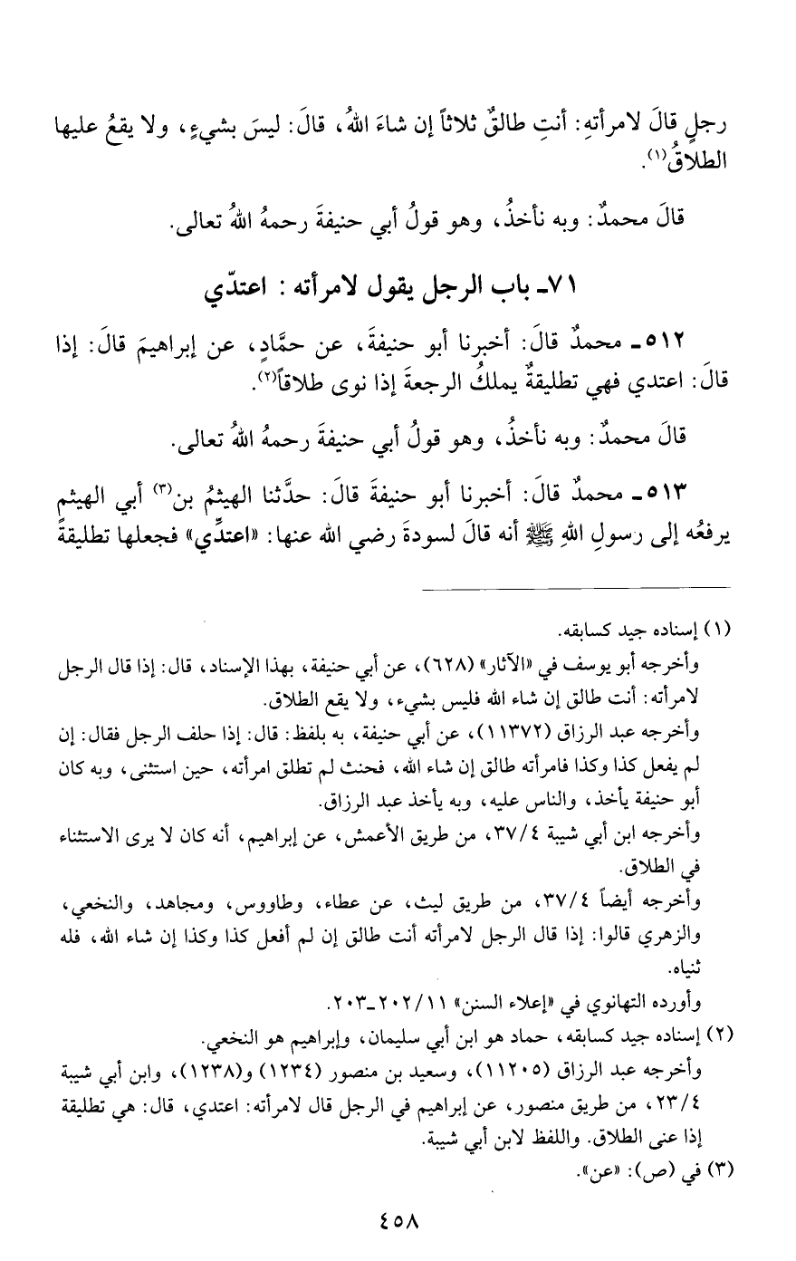 512 - محمد قال: أخبرنا أبو حنيفة, عن حماد, عن إبراهيم قال: إذا قال: اعتدي فهي تطليقة يملك الرجعة إذا نوى طلاقا.
