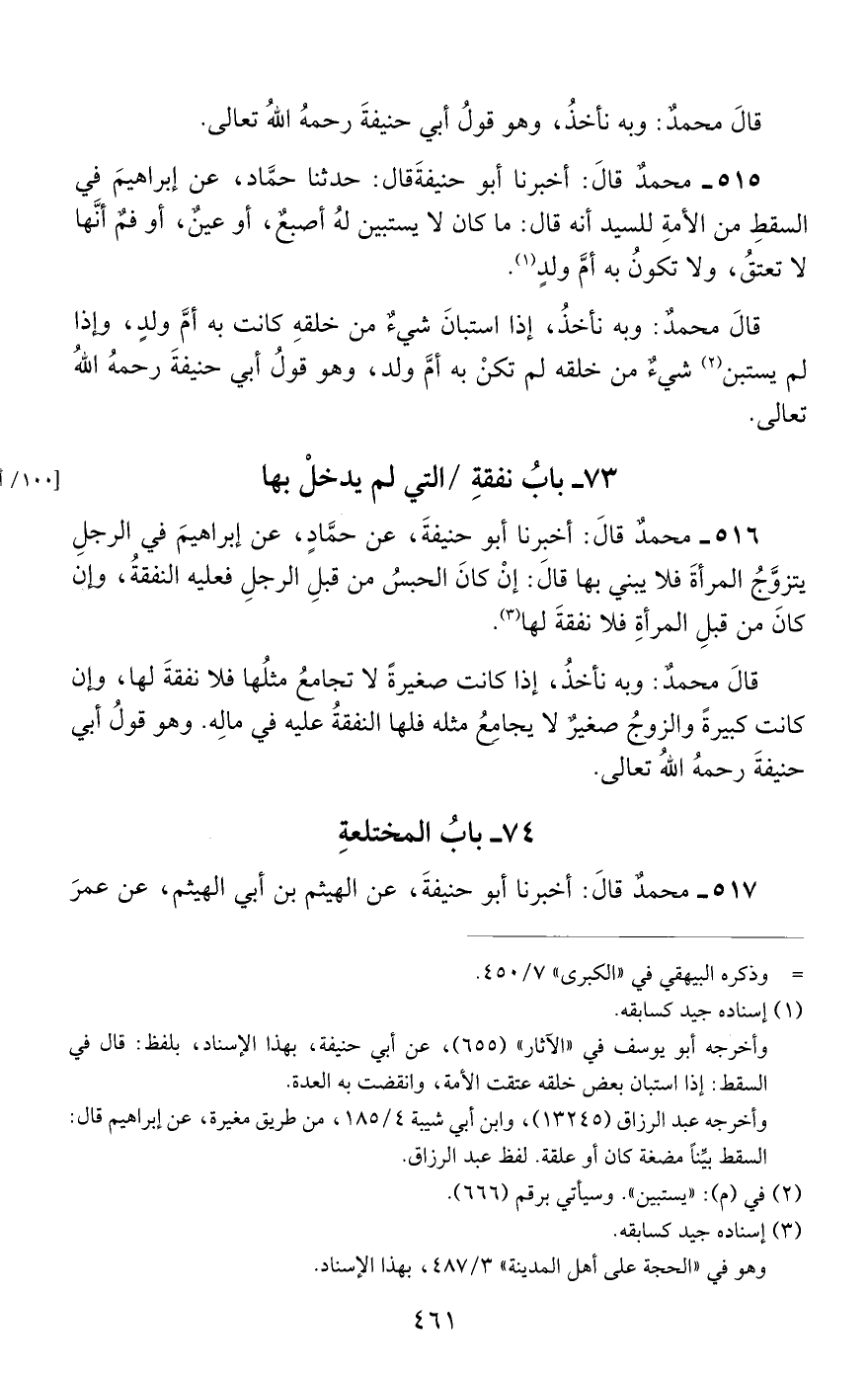 516 - محمد قال: أخبرنا أبو حنيفة, عن حماد, عن إبراهيم في الرجل يتزوج المرأة فلا يبني بها قال: إن كان الحبس من قبل الرجل فعليه النفقة, وإن كان من قبل المرأة فلا نفقة لها.