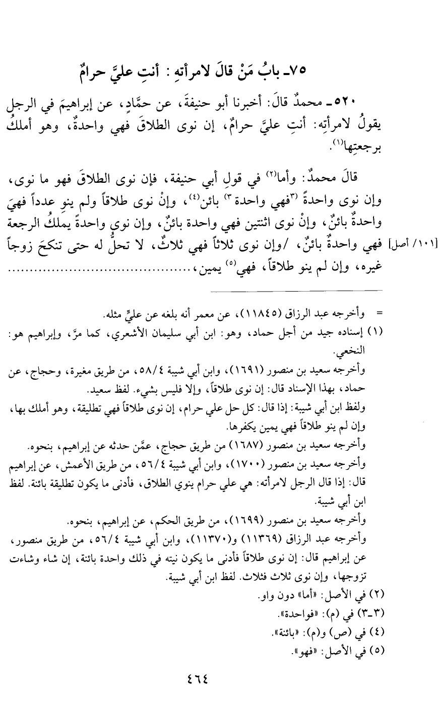 520 - محمد قال: أخبرنا أبو حنيفة, عن حماد, عن إبراهيم في الرجل يقول لامرأته: أنت علي حرام, إن نوى الطلاق فهي واحدة, وهو أملك برجعتها.
