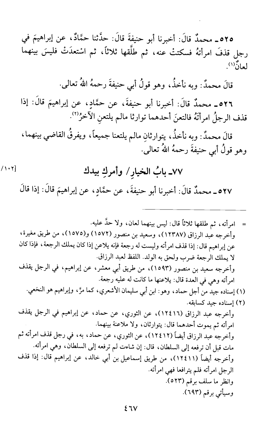 526 - محمد قال: أخبرنا أبو حنيفة, عن حماد, عن إبراهيم قال: إذا قذف الرجل امرأته فالتعن أحدهما توارثا مالم يلتعن الآخر.