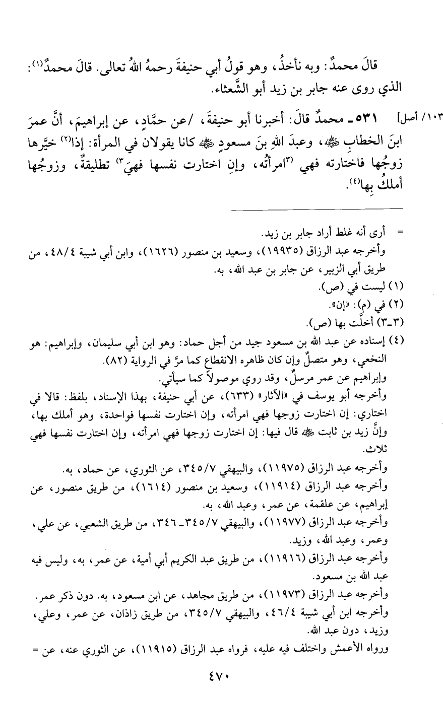 531 - محمد قال: أخبرنا أبو حنيفة, عن حماد, عن إبراهيم, أن عمر بن الخطاب رضي الله عنه, وعبد الله بن مسعود رضي الله عنه كانا يقولان في المرأة: إذا خيرها زوجها فاختارته فهي امرأته, وإن اختارت نفسها فهي تطليقة, وزوجها أملك بها.