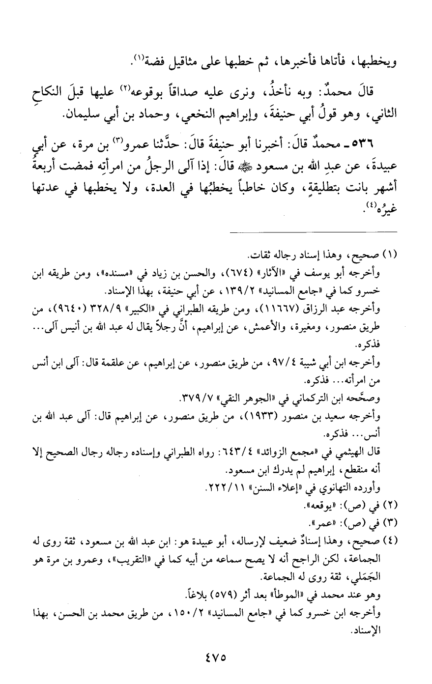 536 - محمد قال: أخبرنا أبو حنيفة قال: حدثنا عمرو بن مرة, عن أبي عبيدة, عن عبد الله بن مسعود رضي الله عنه قال: إذا آلى الرجل من امرأته فمضت أربعة أشهر بانت بتطليقة, وكان خاطبا يخطبها في العدة, ولا يخطبها في عدتها غيره.