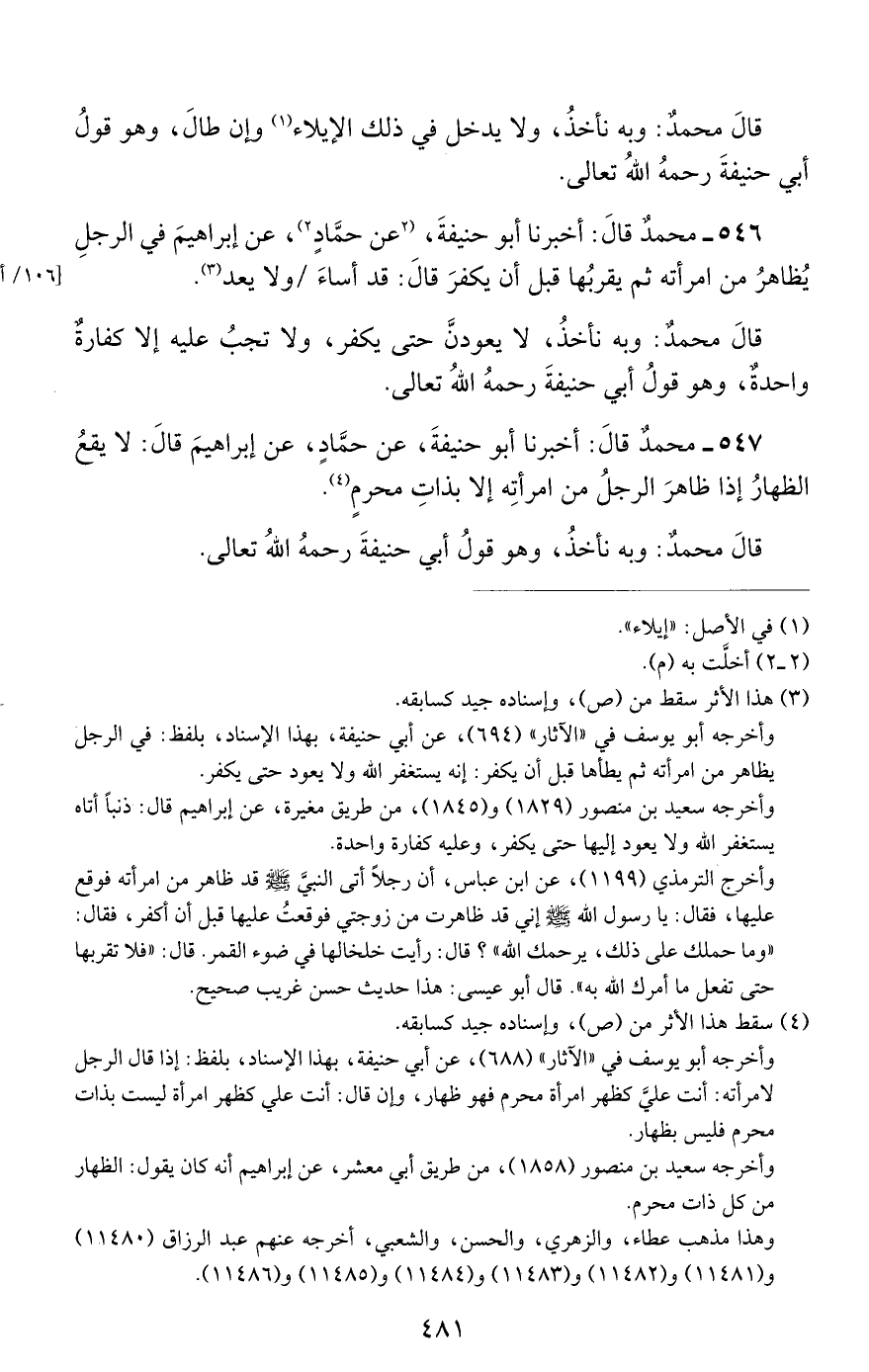 546 - محمد قال: أخبرنا أبو حنيفة, عن حماد, عن إبراهيم في الرجل يظاهر من امرأته ثم يقربها قبل أن يكفر قال: قد أساء ولا يعد.