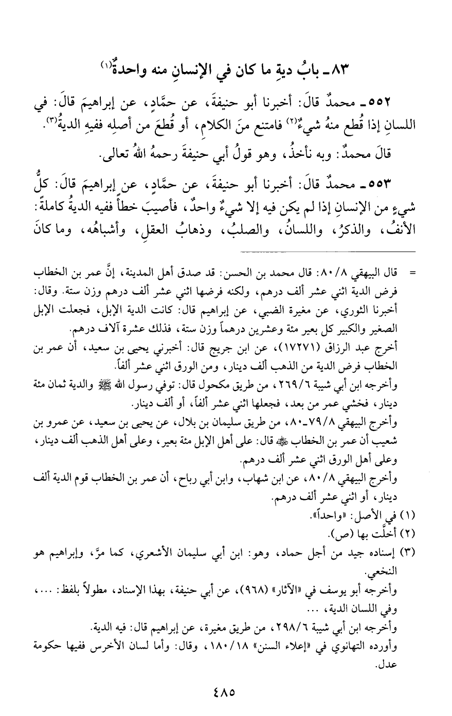 553 - محمد قال: أخبرنا أبو حنيفة, عن حماد, عن إبراهيم قال: كل شيء من الإنسان إذا لم يكن فيه إلا شيء واحد, فأصيب خطأ ففيه الدية كاملة: الأنف, والذكر, واللسان, والصلب, وذهاب العقل, وأشباهه, وما كان #486# في الإنسان اثنين ففي كل واحد منهما نصف الدية: الثديين, واليدين, والرجلين, والعينين, وأشباه ذلك.