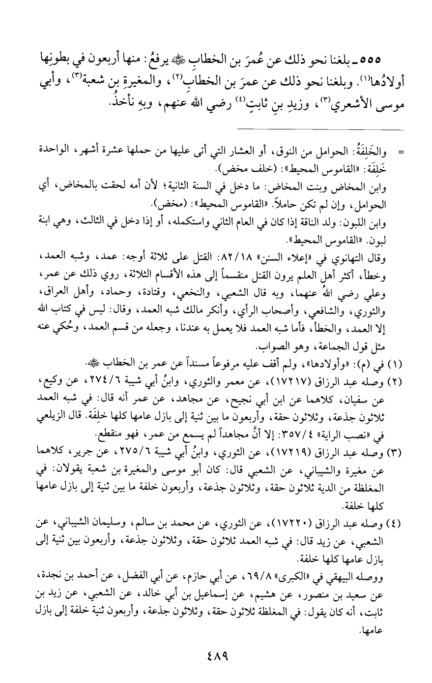 555 - بلغنا نحو ذلك عمر بن الخطاب رضي الله عنه يرفع: منها أربعون في بطونها أولادها. وبلغنا نحو ذلك عن عمر بن الخطاب, والمغيرة بن شعبة, وأبي موسى الأشعري, وزيد بن ثابت رضي الله عنهم, وبه نأخذ.