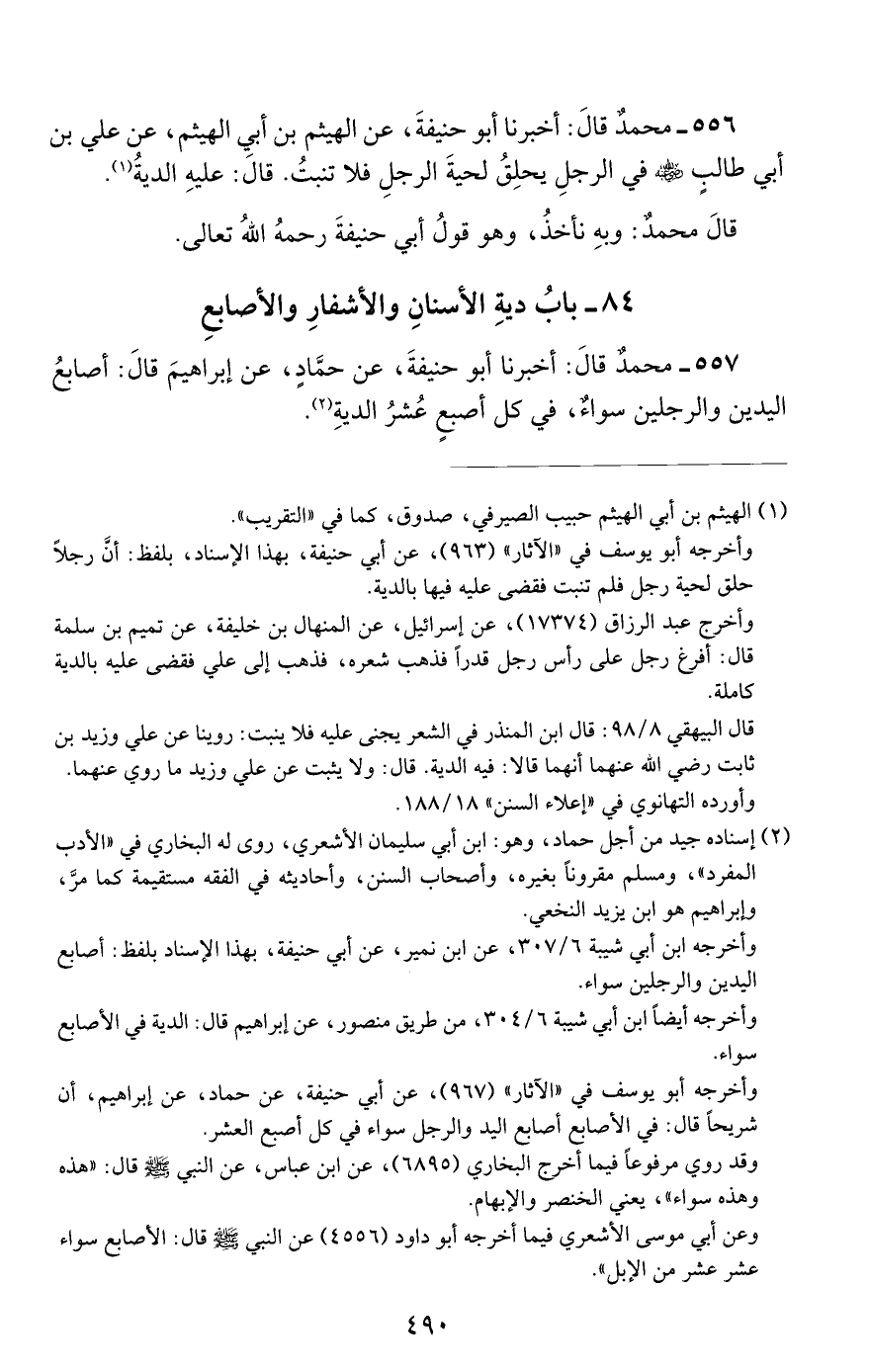 557 - محمد قال: أخبرنا أبو حنيفة, عن حماد, عن إبراهيم قال: أصابع اليدين والرجلين سواء, في كل أصبع عشر الدية.