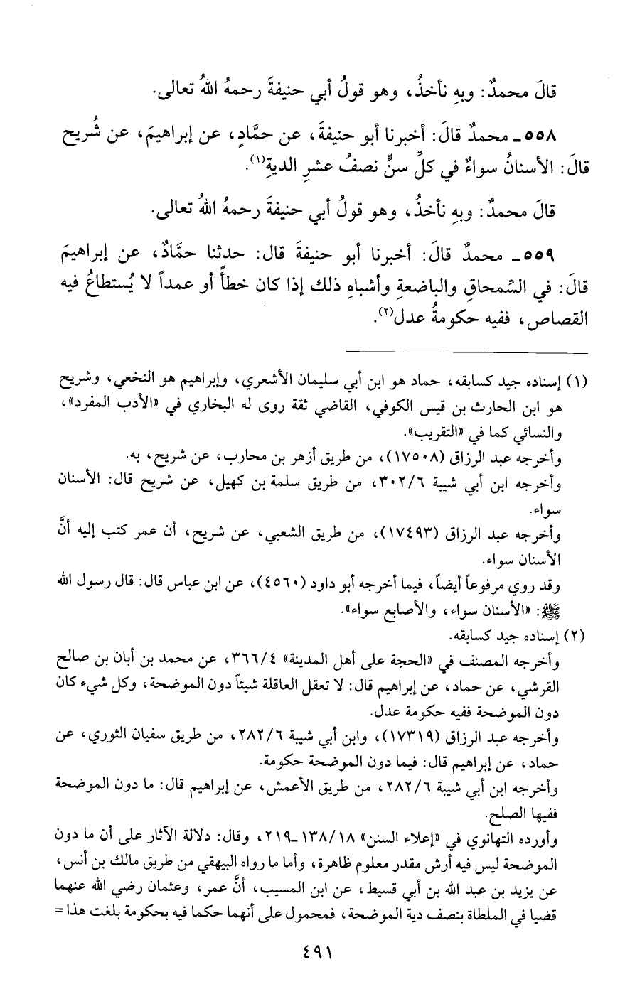 558 - محمد قال: أخبرنا أبو حنيفة, عن حماد, عن إبراهيم, عن شريح قال: الأسنان سواء في كل سن نصف عشر الدية.
