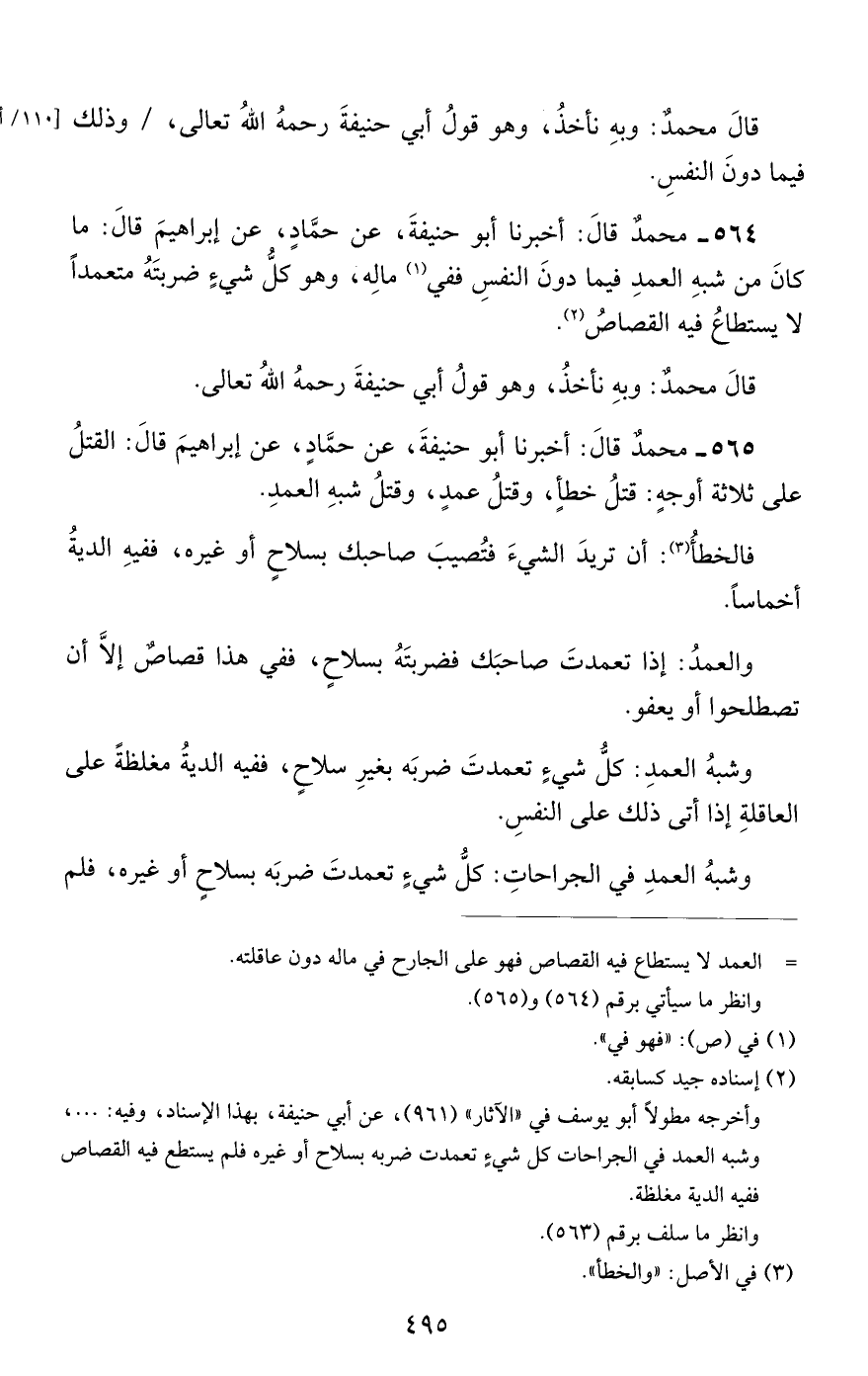 564 - محمد قال: أخبرنا أبو حنيفة, عن حماد, عن إبراهيم قال: ما كان من شبه العمد فيما دون النفس ففي ماله, وهو كل شيء ضربته متعمدا لا يستطاع فيه القصاص.