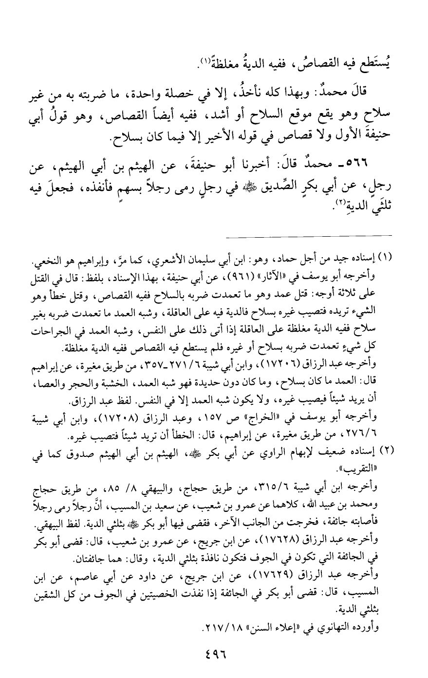566 - محمد قال: أخبرنا أبو حنيفة, عن الهيثم بن أبي الهيثم, عن رجل, عن أبي بكر الصديق رضي الله عنه في رجل رمى رجل بسهم فأنفذه, فجعل فيه ثلثي الدية.