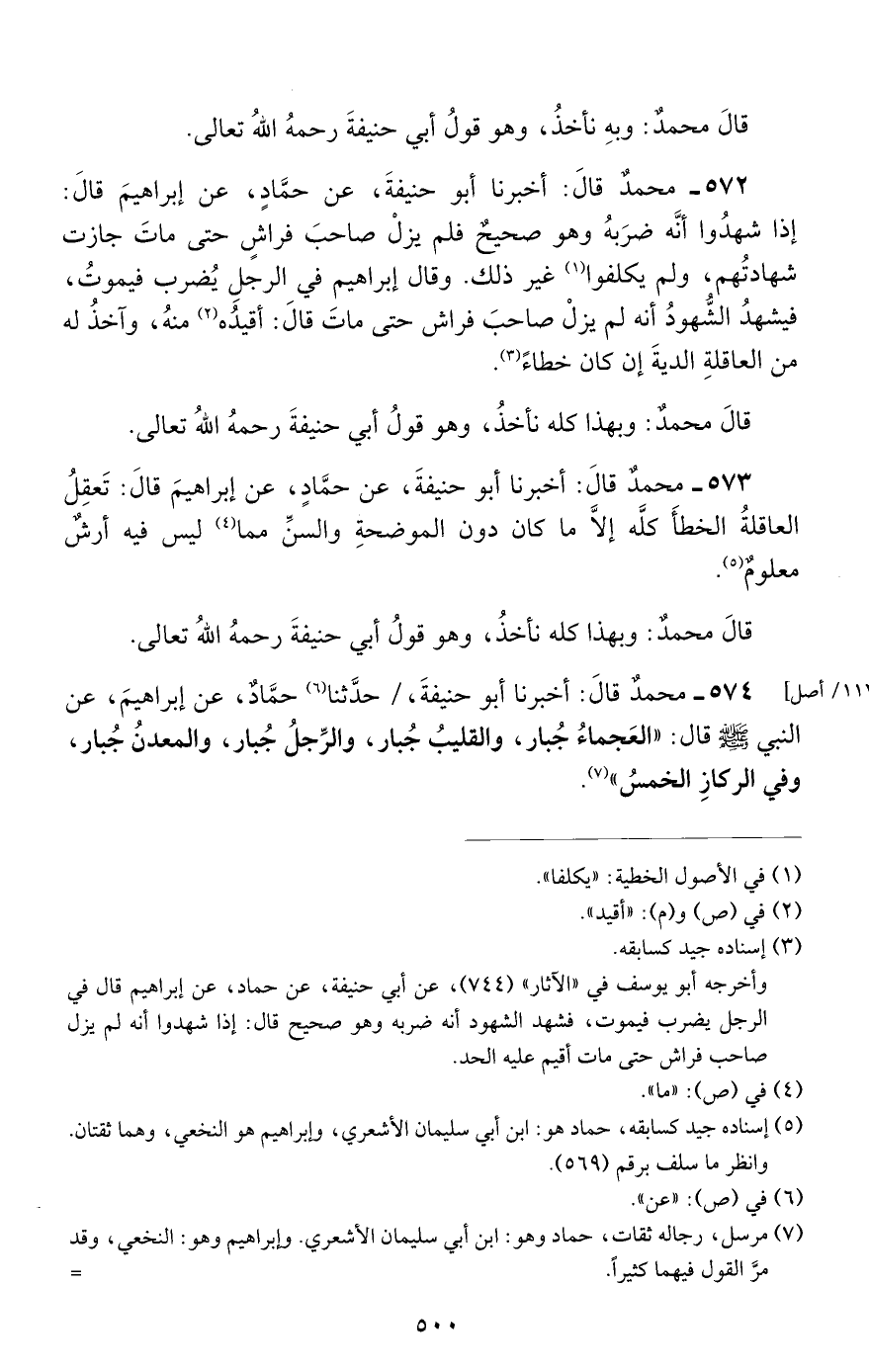573 - محمد قال: أخبرنا أبو حنيفة, عن حماد, عن إبراهيم قال: تعقل العاقلة الخطأ كله إلا ما كان دون الموضحة والسن مما ليس فيه أرش معلوم.
