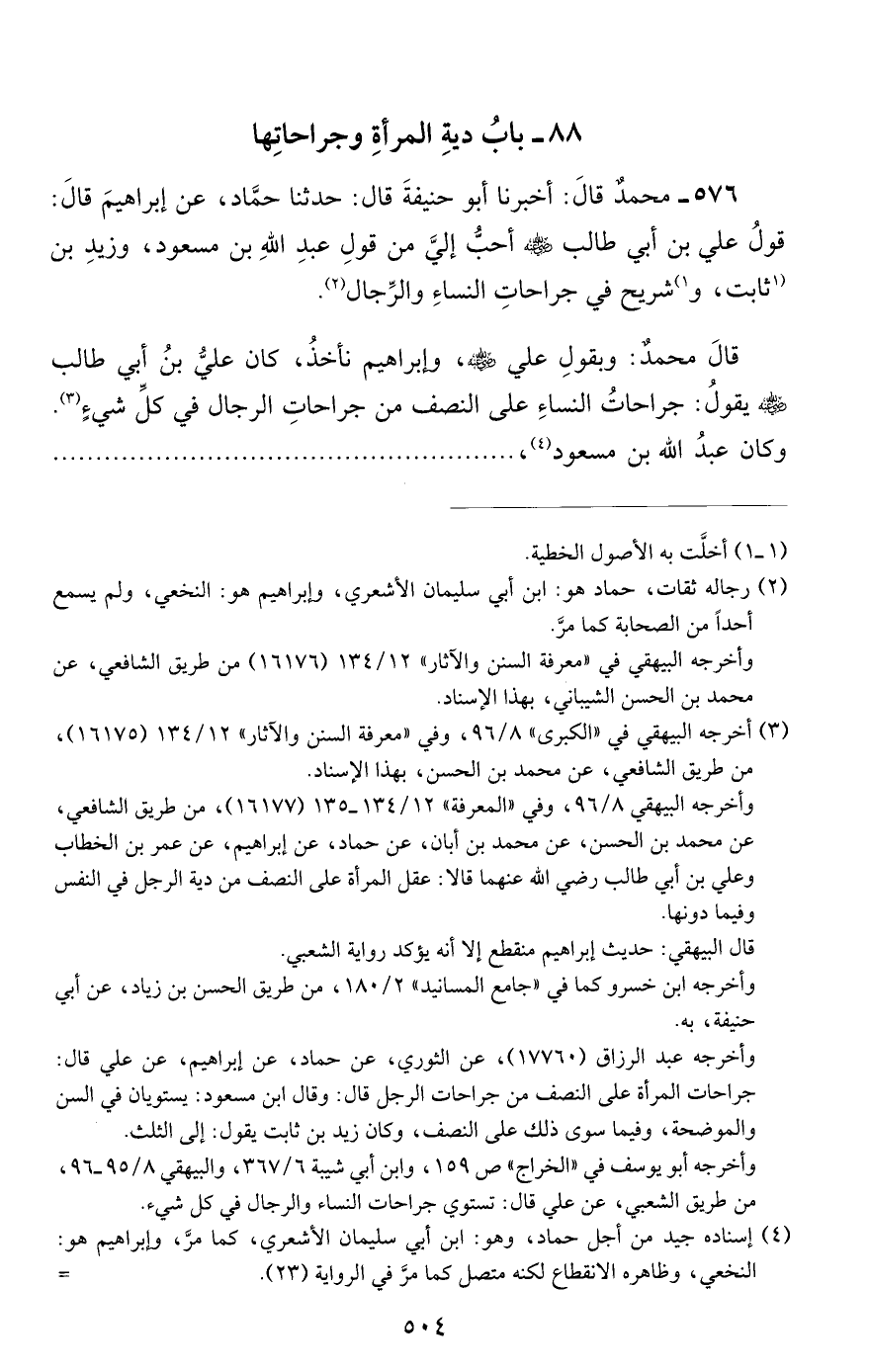 576 - محمد قال: أخبرنا أبو حنيفة قال: حدثنا حماد, عن إبراهيم قال: قول علي بن أبي طالب رضي الله عنه أحب إلي من قول عبد الله بن مسعود, وزيد بن ثابت, وشريح في جراحات النساء والرجال.