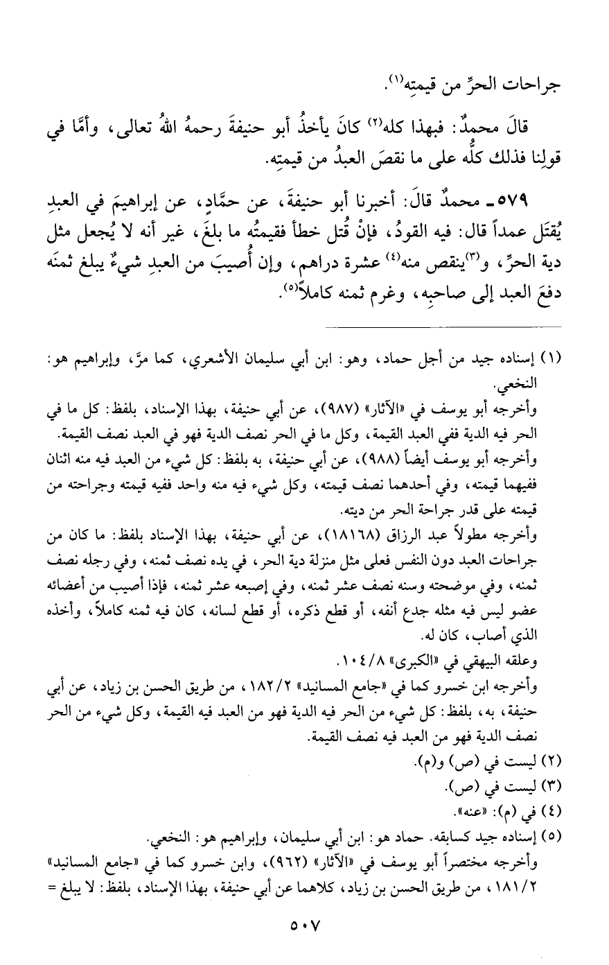 579 - محمد قال: أخبرنا أبو حنيفة, عن حماد, عن إبراهيم في العبد يقتل عمدا قال: فيه القود, فإن قتل خطأ فقيمته ما بلغ, غير أنه لا يجعل مثل دية الحر, وينقص منه عشرة دراهم, وإن أصيب من العبد شيء يبلغ ثمنه دفع العبد إلى صاحبه, وغرم ثمنه كاملا.