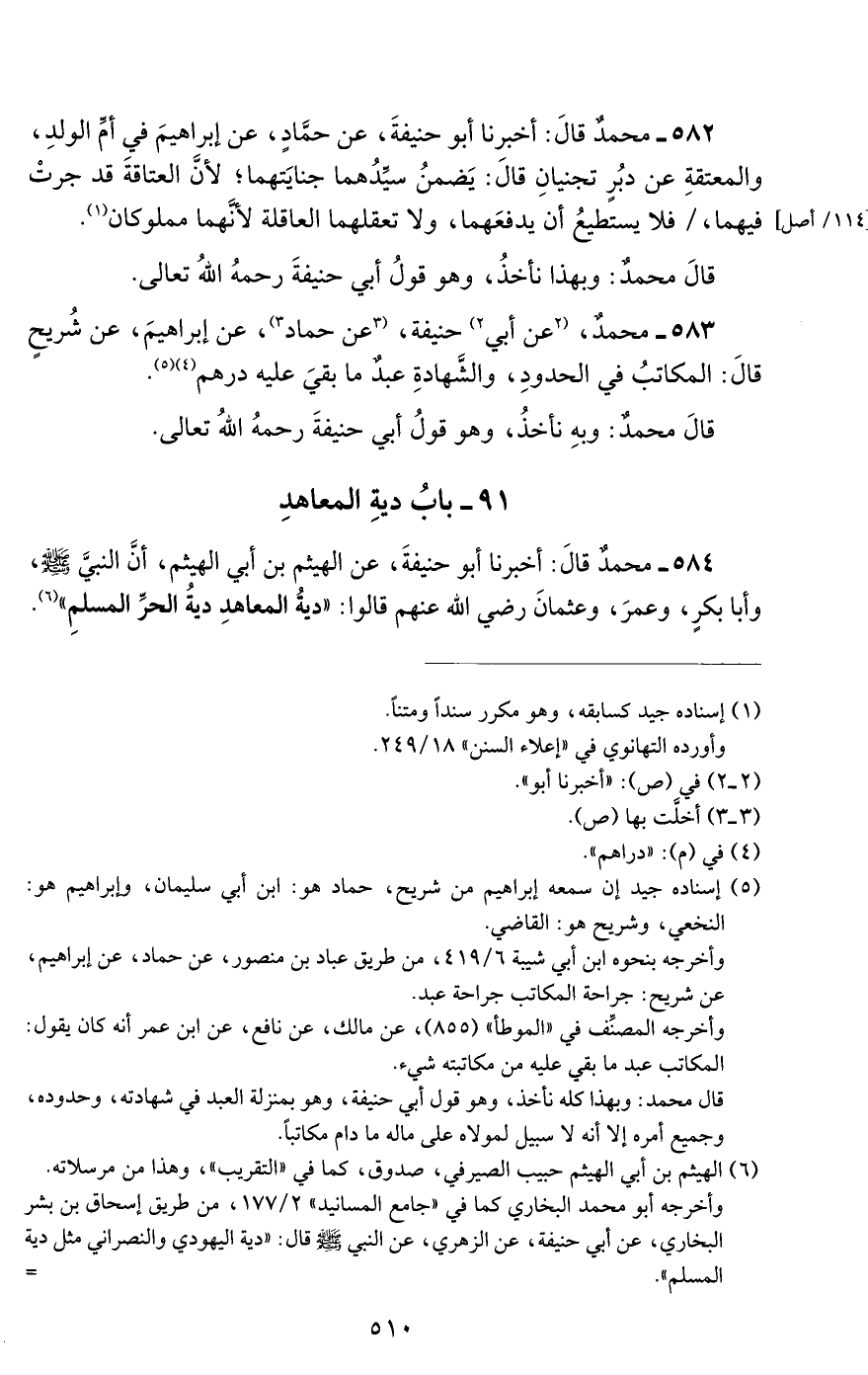 584 - محمد قال: أخبرنا أبو حنيفة, عن الهيثم بن أبي الهيثم, أن النبي صلى الله عليه وسلم, وأبا بكر, وعمر, وعثمان رضي الله عنهم قالوا: دية المعاهد دية الحر المسلم.