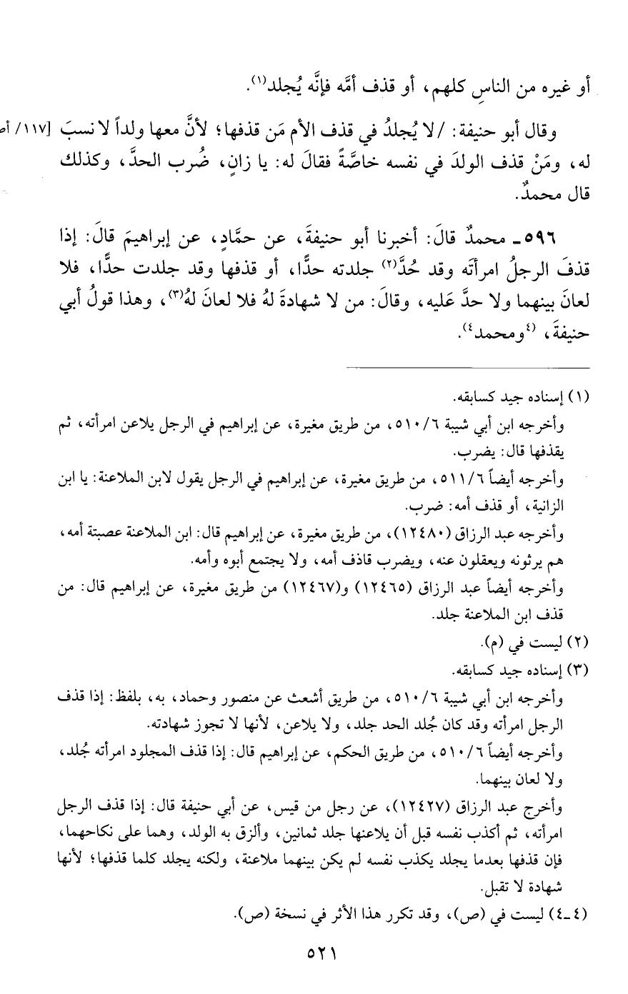 596 - محمد قال: أخبرنا أبو حنيفة, عن حماد, عن إبراهيم قال: إذا قذف الرجل امرأته وقد حد جلدته حدا, أو قذفها وقد جلدت حدا, فلا لعان بينهما ولا حد عليه, وقال: من لا شهادة له فلا لعان له, وهذا قول أبي حنيفة ومحمد.