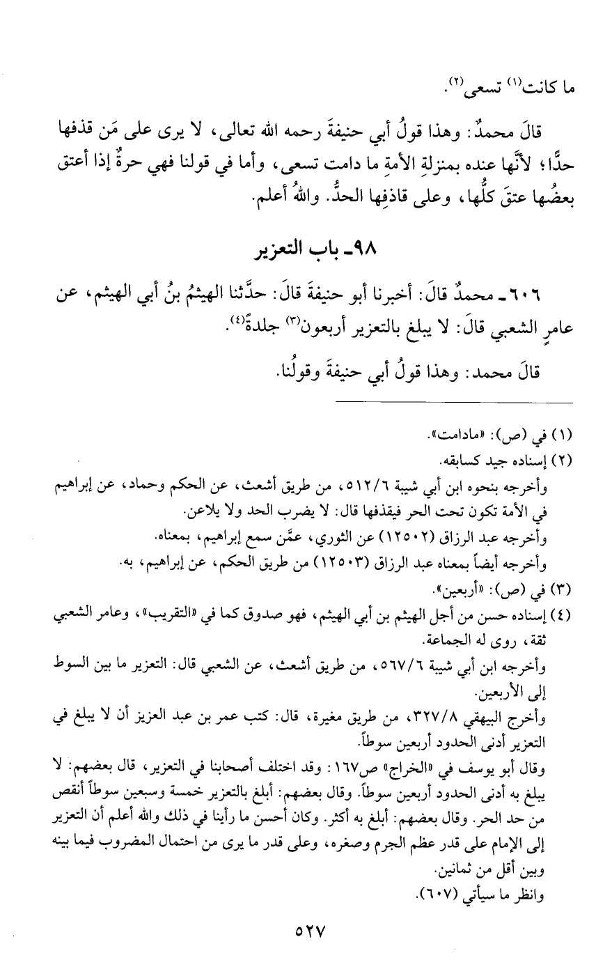 606 - محمد قال: أخبرنا أبو حنيفة قال: حدثنا الهيثم بن أبي الهيثم, عن عامر الشعبي قال: لا يبلغ بالتعزير أربعون جلدة.