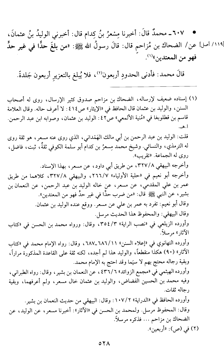 607 - محمد قال: أخبرنا مسعر بن كدام قال: أخبرني الوليد بن عثمان, عن الضحاك بن مزاحم قال: قال رسول الله صلى الله عليه وسلم: من بلغ حدا في غير حد فهو من المعتدين.
