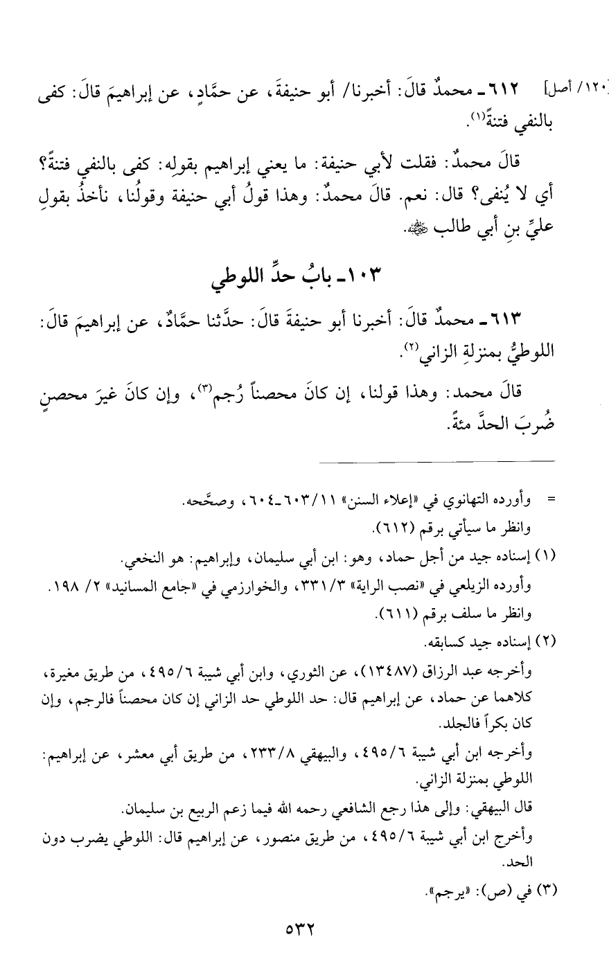 613 - محمد قال: أخبرنا أبو حنيفة قال: حدثنا حماد, عن إبراهيم قال: اللوطي بمنزلة الزاني.
