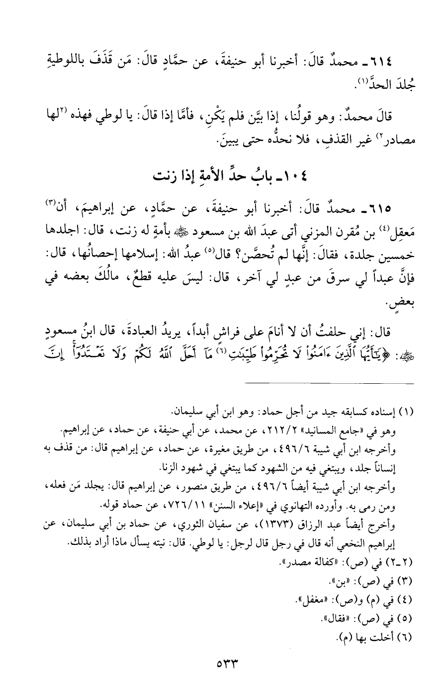 614 - محمد قال: أخبرنا أبو حنيفة, عن حماد قال: من قذف باللوطية جلد الحد.