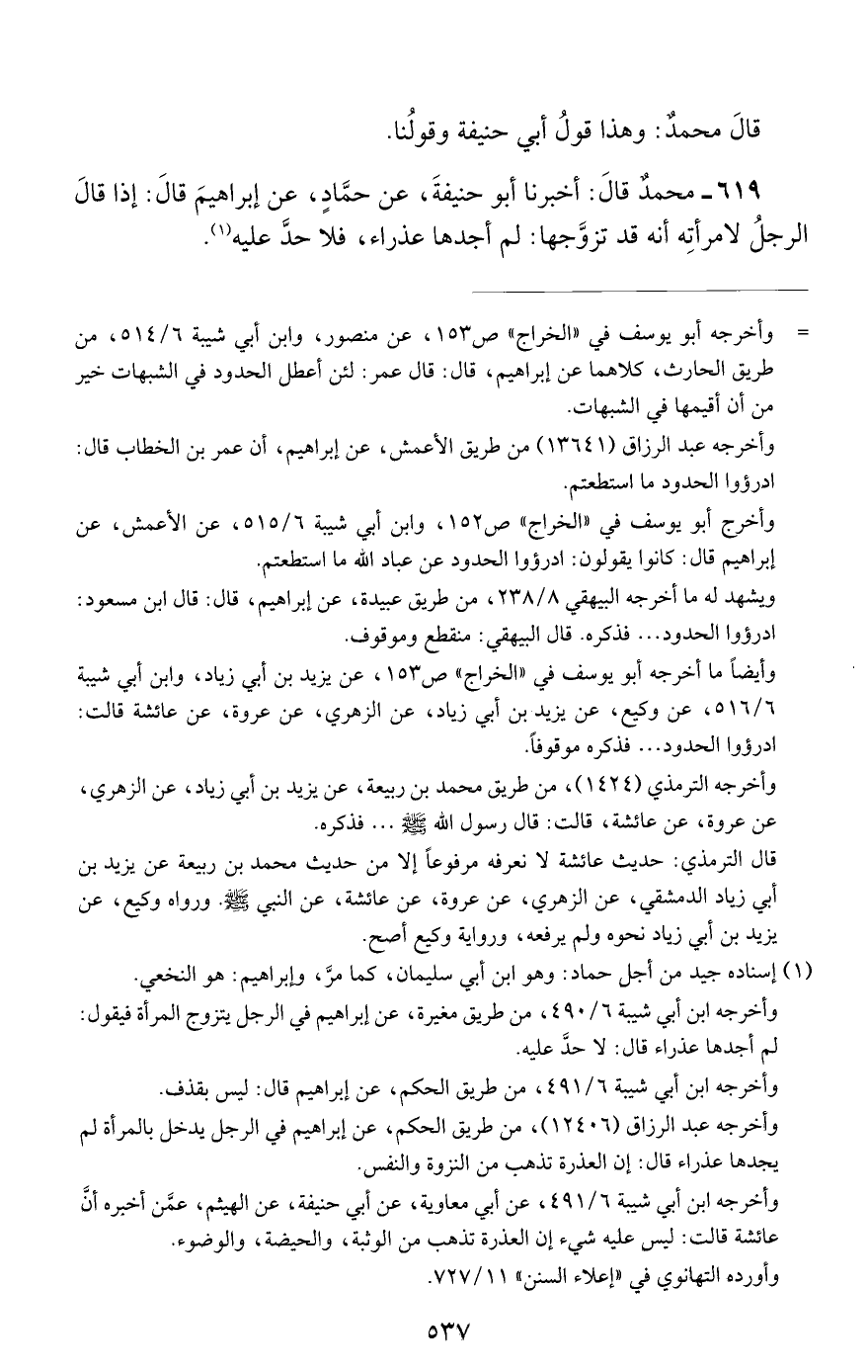 619 - محمد قال: أخبرنا أبو حنيفة, عن حماد, عن إبراهيم قال: إذا قال الرجل لامرأته أنه قد تزوجها: لم أجدها عذراء, فلا حد عليه.
