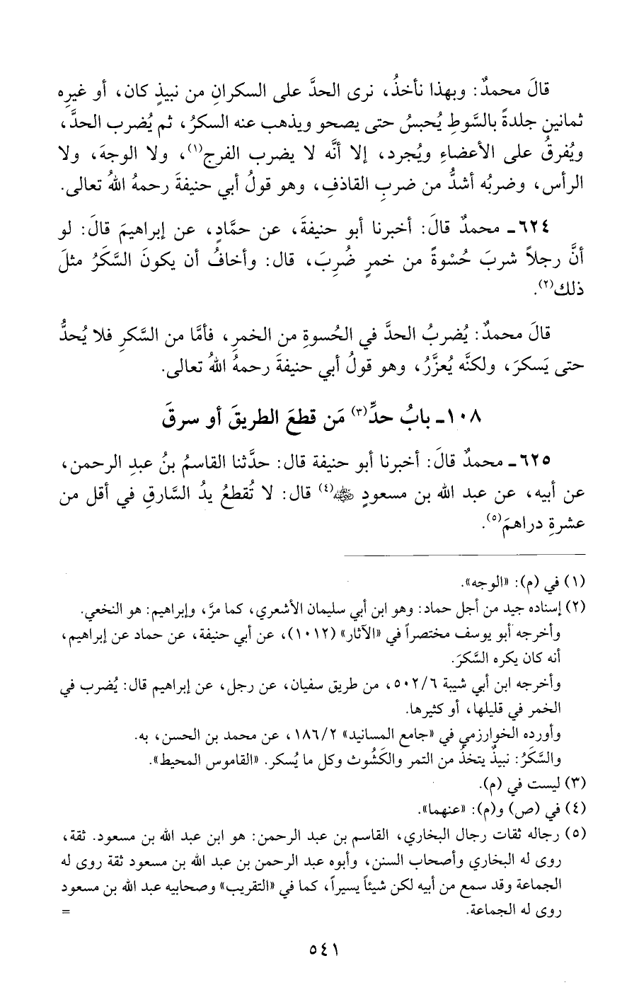 625 - محمد قال: أخبرنا أبو حنيفة قال: حدثنا القاسم بن عبد الرحمن, عن أبيه, عن عبد الله بن مسعود رضي الله عنه قال: لا تقطع يد السارق في أقل من عشرة دراهم.
