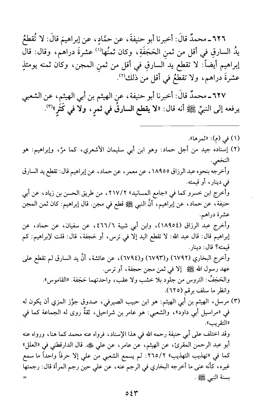 626 - محمد قال: أخبرنا أبو حنيفة, عن حماد, عن إبراهيم قال: لا تقطع يد السارق في أقل من ثمن الحجفة, وكان ثمنها عشرة دراهم, وقال: قال إبراهيم أيضا: لا تقطع يد السارق في أقل من ثمن المجن, وكان ثمنه يومئذ عشرة دراهم, ولا تقطع في أقل من ذلك.