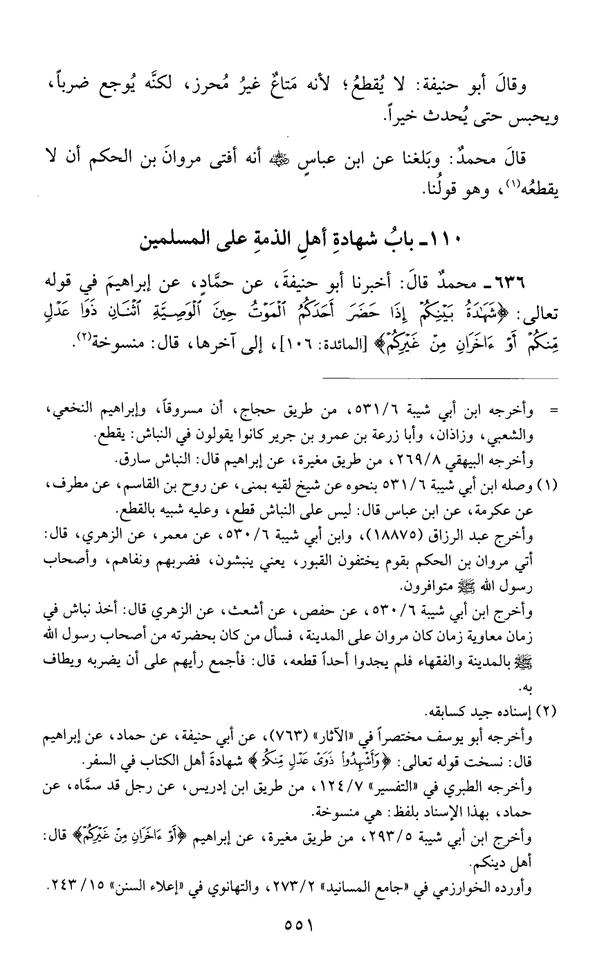 636 - محمد قال: أخبرنا أبو حنيفة, عن حماد, عن إبراهيم في قوله تعالى {شهادة بينكم إذا حضر أحدكم الموت حين الوصية اثنان ذوا عدل منكم أو آخران من غيركم} , إلى آخرها, قال: منسوخة.